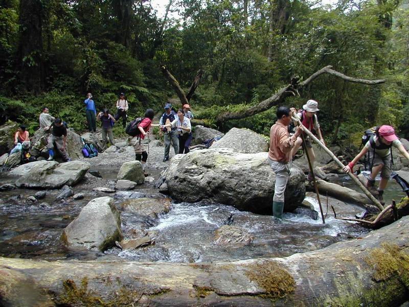 0907過第四處溪溝, 水量不小, 鄭前輩穿著雨鞋站在溪中, 將山友一一接過