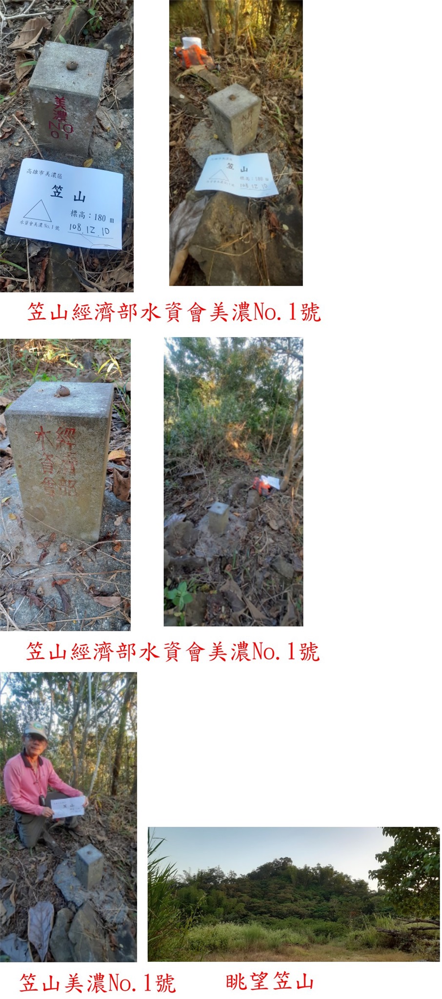 5、笠山:位在高雄市美濃區,標高180公尺,經濟部水資會美濃No.1號基石;座標206603 2537250。