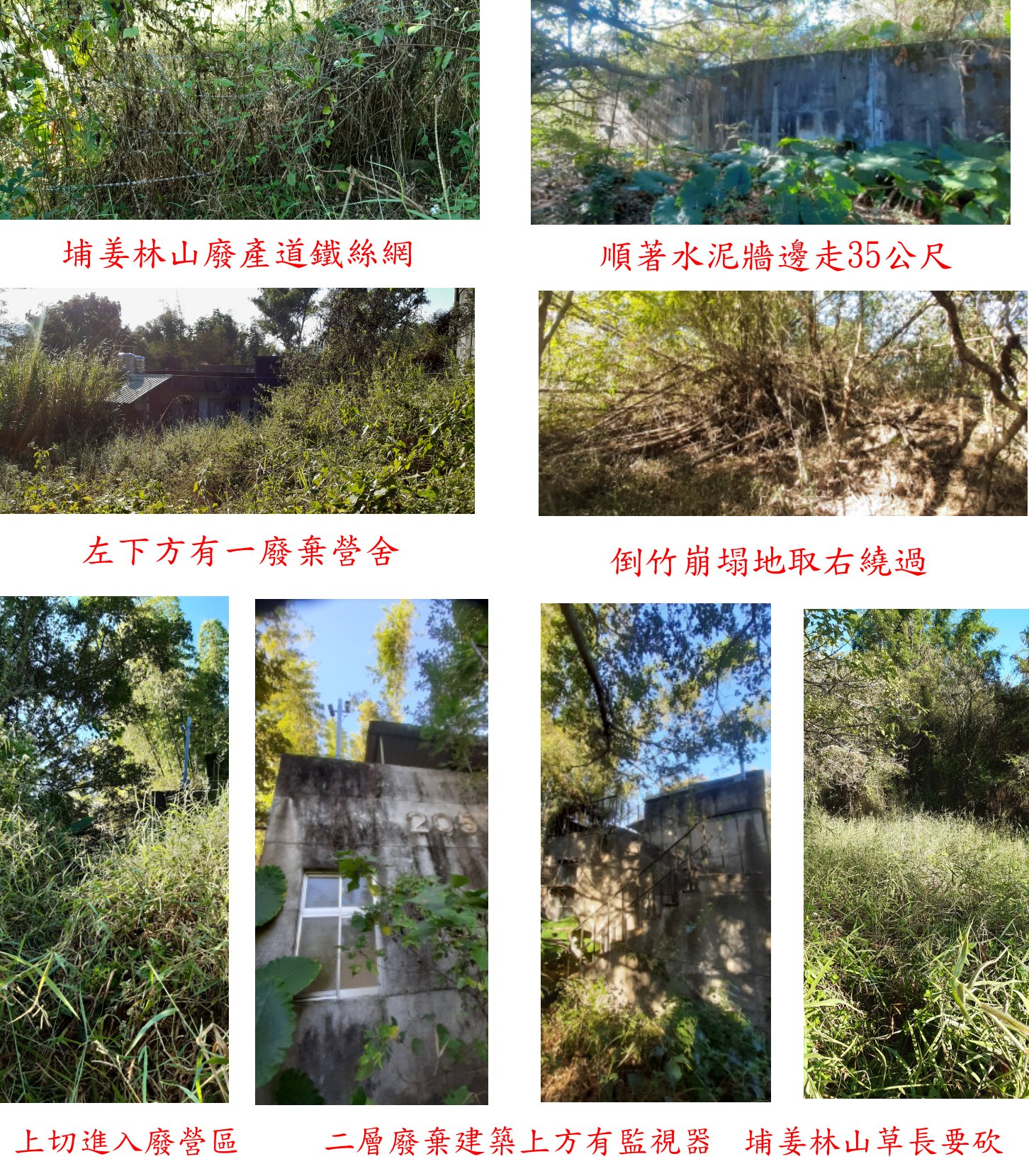 取右墓園階梯路走40餘公尺上至稜線,取右墓園小徑走70餘公尺墓園區有高架的蓄水塔,前方即土路的終點;再來稜線為比人高的芒草叢砍路走20餘公尺,很難砍要花很多時間退回,取右下繞進入墓園區走約