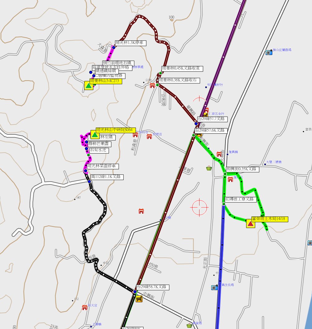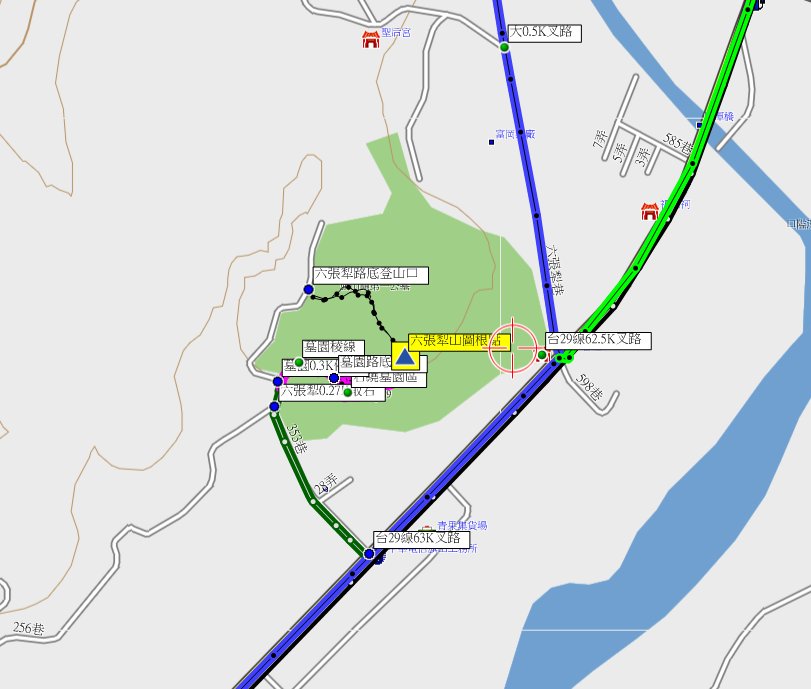 由六張犁山原路回至台29線63K叉路,右轉台29線走0.85K,左轉堤防旁道走1.4K,左轉台3線走0.75K,左轉台28線過旗山橋走1K叉路(31.3K處);左轉興中路走