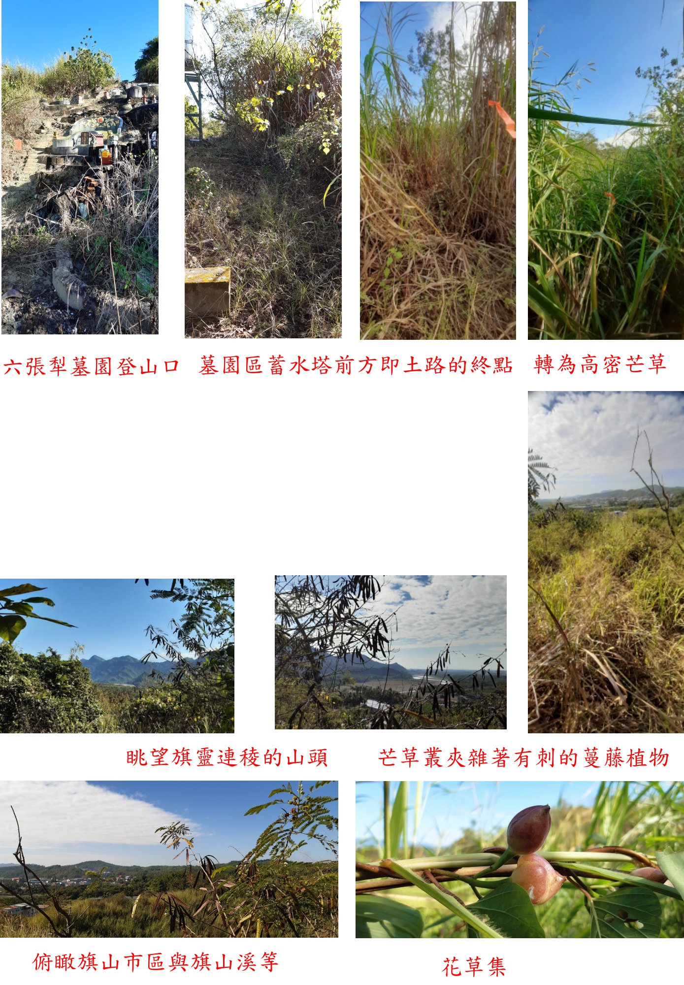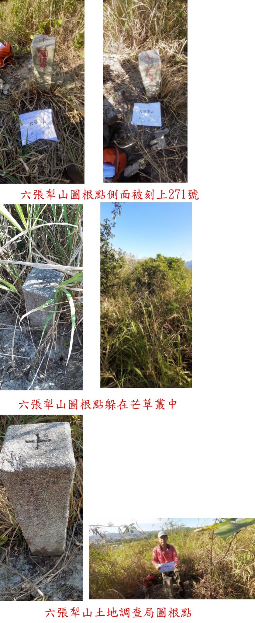 高雄基石之旅第三天(12/10)行程仍然為旗山週邊的基石,第1座為埔姜林中研院S064銅標,此點走廢產道至荒廢的芒果園,再來草比人草很難搞,走了17分鐘抵達基點時只見到一等衛星點標示牌,找了一下才方於草叢中找到中研院S064號銅標與一等水準點水泥柱;第2顆為埔姜林3-IC273,此點於廢棄營區內係校長找到,走廢產道進入廢棄營區,於涼亭邊找到內補273號基石,上山走15分鐘難度不高;第3座為六張犁山圖根點,此點於墓園上方山徑荒廢要自行闢路,過墓園後稜線芒草比人高、還有帶刺的蔓藤被刺的傷痕累累,直線只有