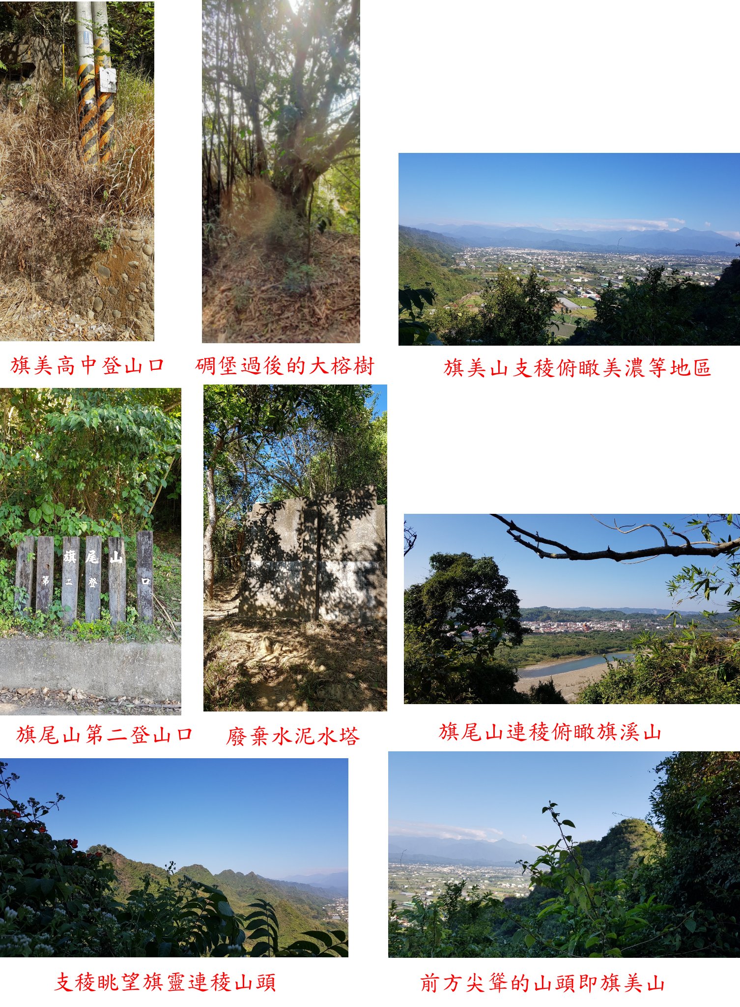 取右入路況佳的山徑走7分鐘抵稜線叉路,右下往北旗尾山不取,取左順稜往旗尾山方向緩上經水泥水塔,稜線徑走11分鐘抵達196山頭;取右支稜緩下往旗美山,前行隨即有一廢棄水泥水塔,剛開始一段路路況尚可隨即轉為刺竹叢很難通過,取左下繞避過再回至稜線,再度遇到蔓藤區很難通過,直線只剩