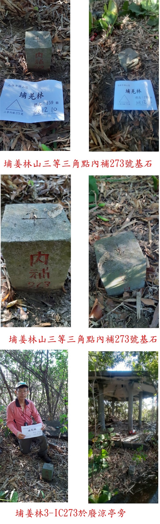 2、埔姜林山3-IC273:位於高雄市旗山區,標高159公尺,3-492原點已遺失,另立三等三角點內補273號基石;座標198230 2539197。