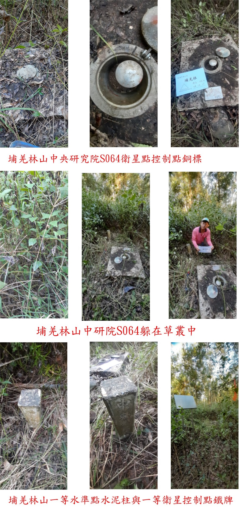 1、埔羌林山中研院S064:位於高雄市旗山區,標高146公尺,中央研究院地殼變動基準點S064號銅標;座標198274 2538885。