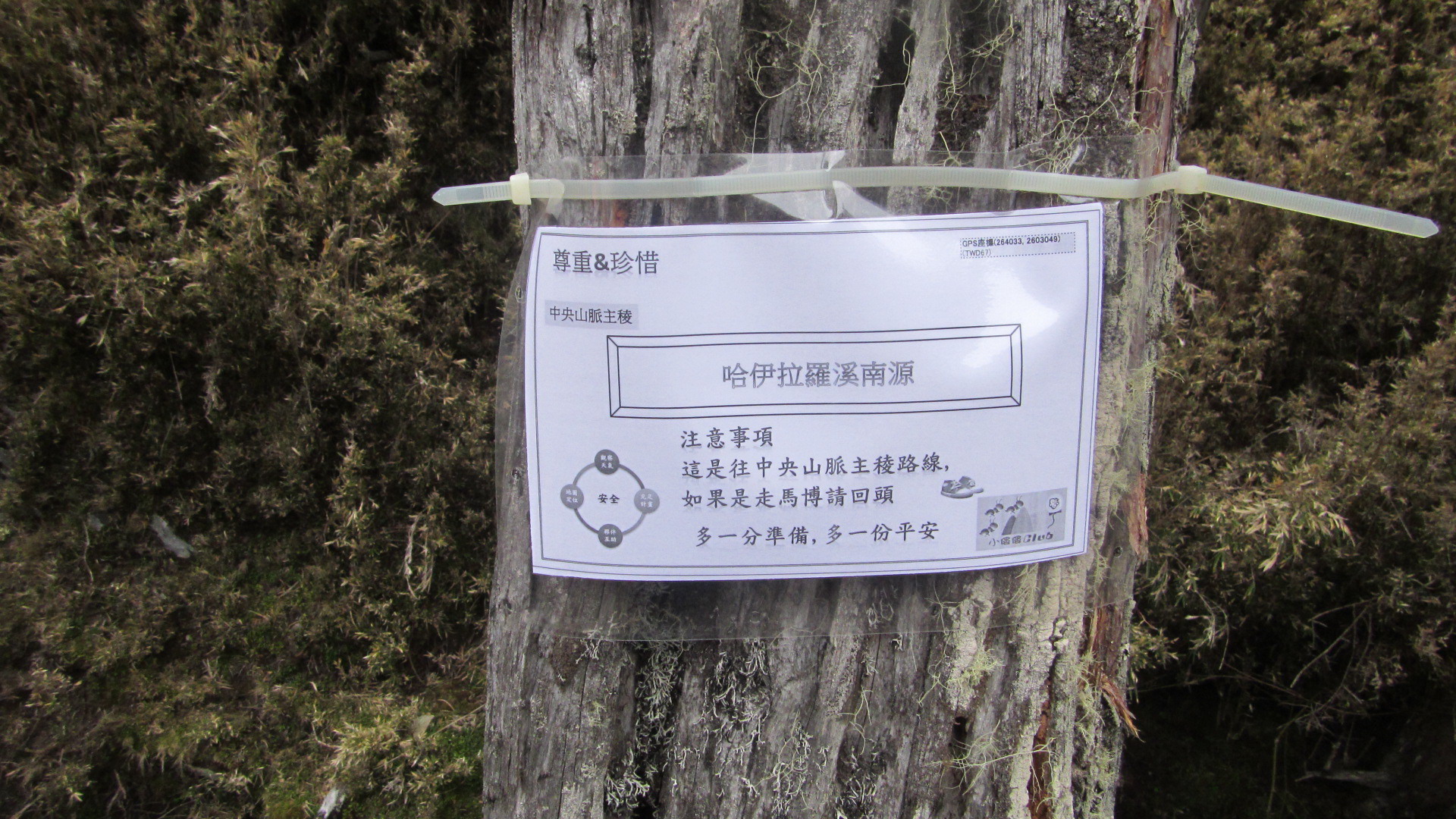 0925-0950續行抵達八通關山登山口(250093 2597958)。連續下坡,但是有些路徑太空曠,布條也不連續,有兩處要找一下路
