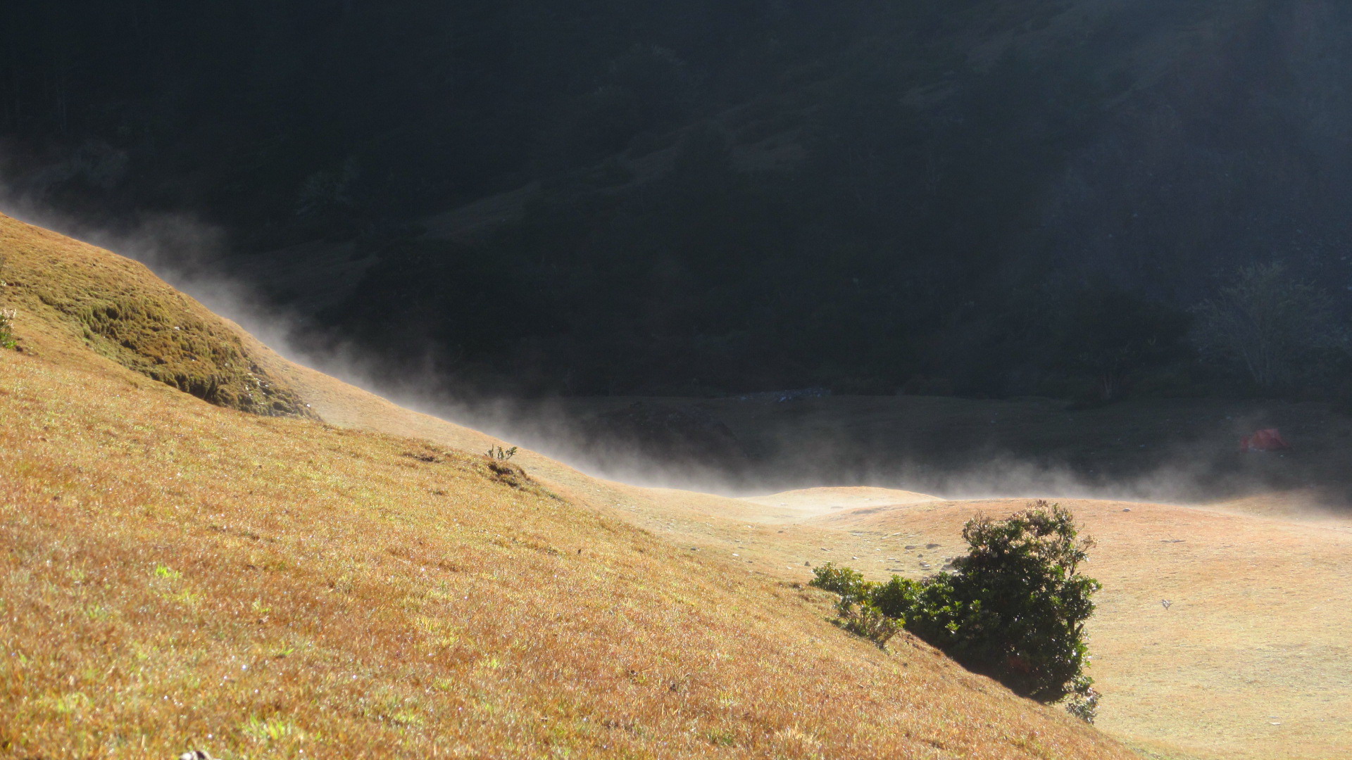 1630-1930 回營地休息,下了幾滴雨就停了,晚上起濃霧,風很大,還好沒下雨風很大,風大很冷把衣服都穿起來,研究地圖,ㄚ傑提議直接走腰繞路,比較省時間,看地圖上時間是這樣沒錯,但是比較危險,晚餐後就趕緊睡覺,半夜風很大,沒有睡得很好,