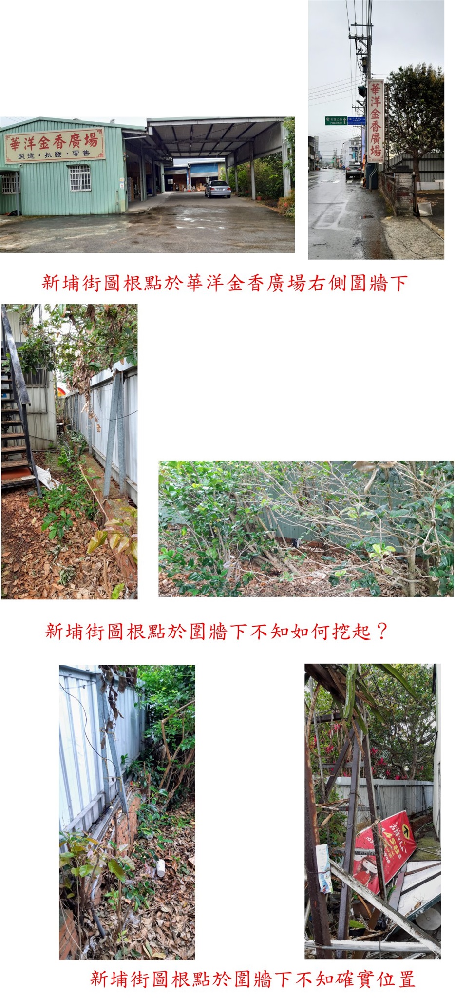 基石達人文達兄曾看過並告知如何找,基石原於水泥田埂中後田埂加蓋圍牆被埋;新埔街圖根點於華洋金香廣場右側圍牆下早期曾留有一洞,只能由圍牆外挖(只能看到十字),圍牆與隔壁鐵皮屋有寬約