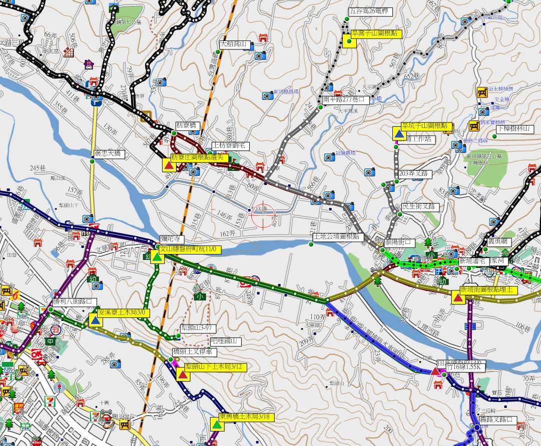 2、新埔街:位於新竹縣新埔鎮,標高52公尺,土地調查局圖根點埋土找不到;座標256876 2746585。