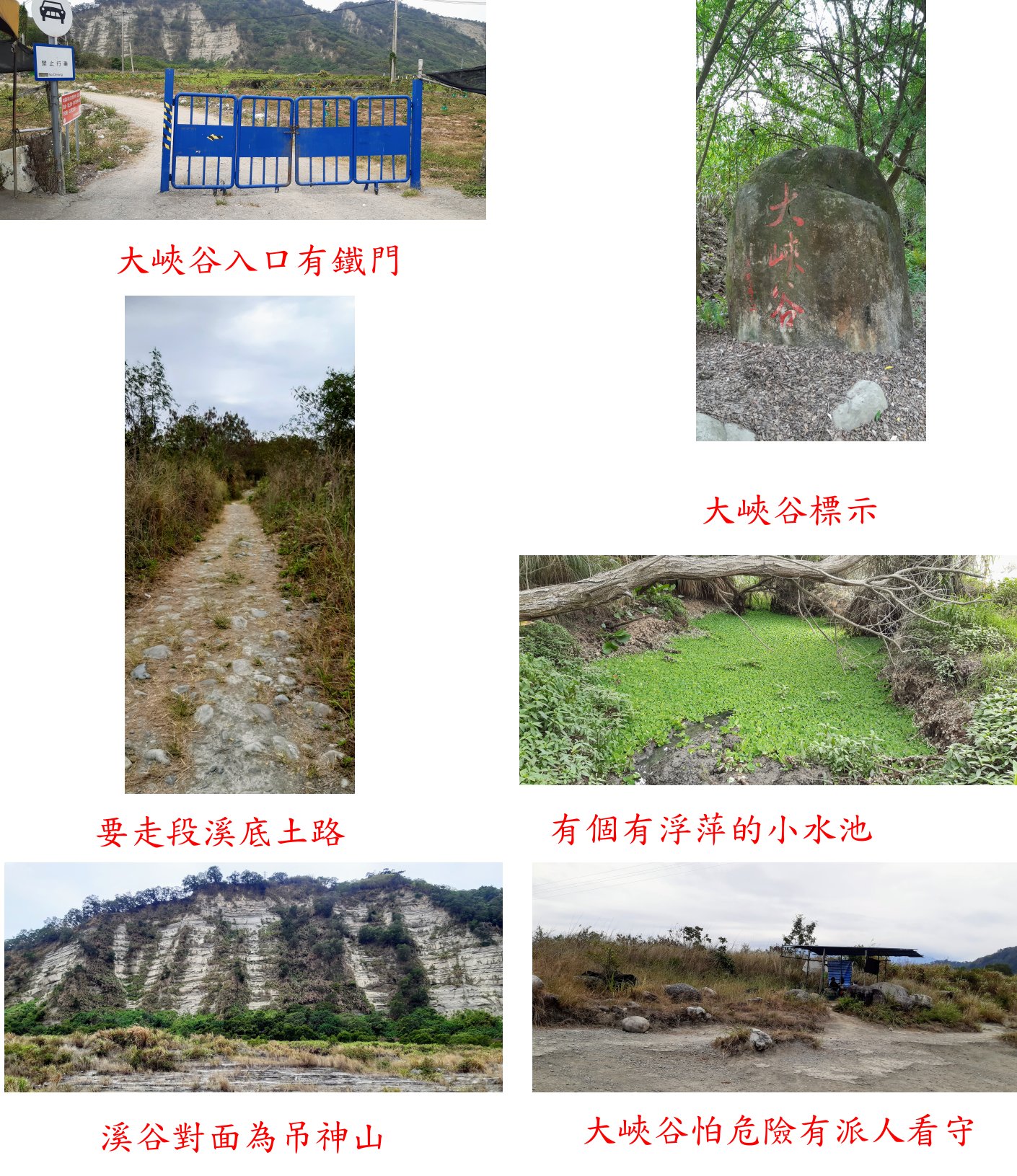 由新埔街彎繞至竹北交流道上國道1號南下至三義交流道下,走台13線往南走3.8K,靠右走接尖豐路走約1K叉路,左轉140線(堤防道路)東行走12.8K停車(27.7K處),大峽谷入口有多個水果攤,溪谷對面為吊神山。