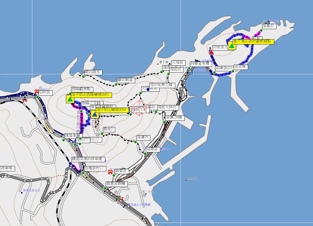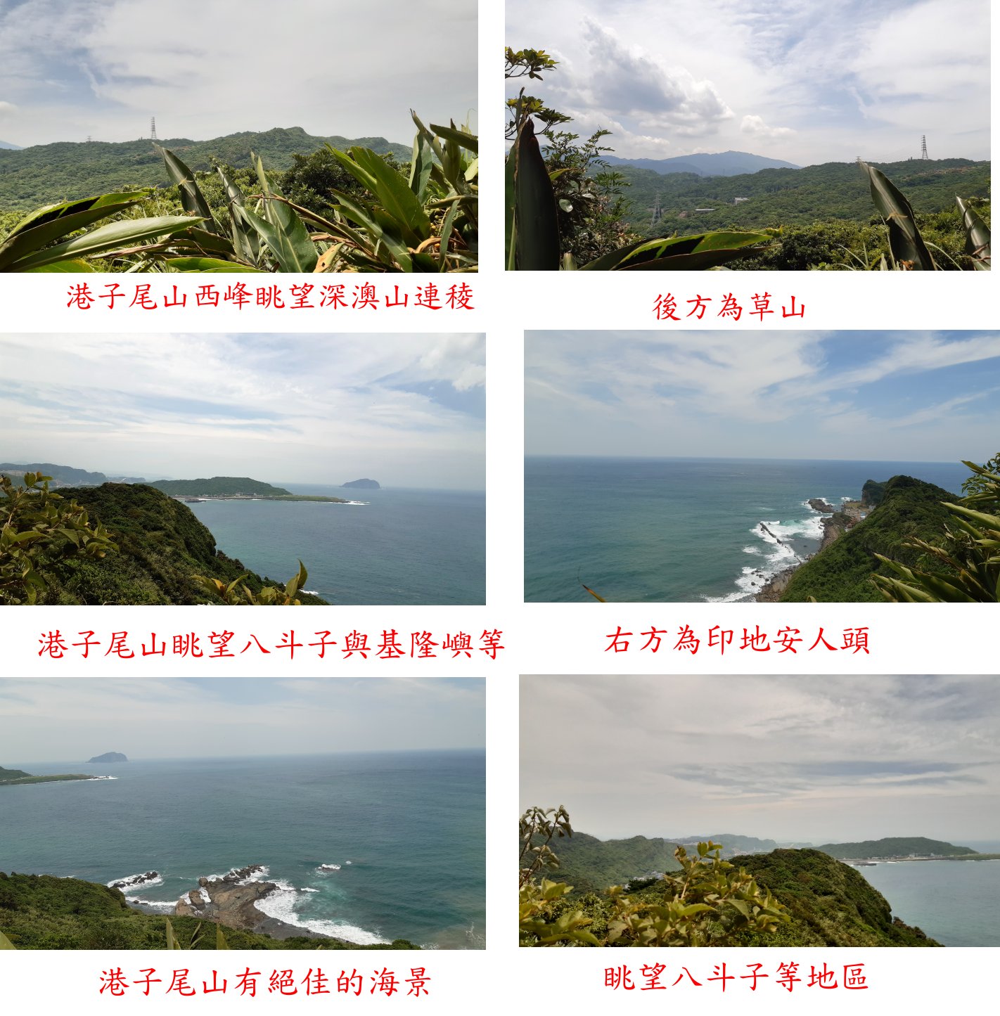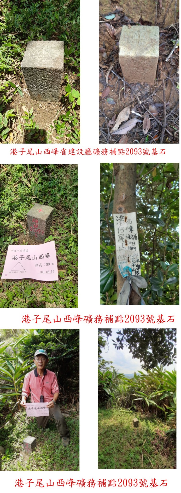 4、港子尾山西峰:又稱深澳港山,位於新北市瑞芳區,標高89公尺,省建設廳礦務補點 2093號基石;座標331231 2780898。