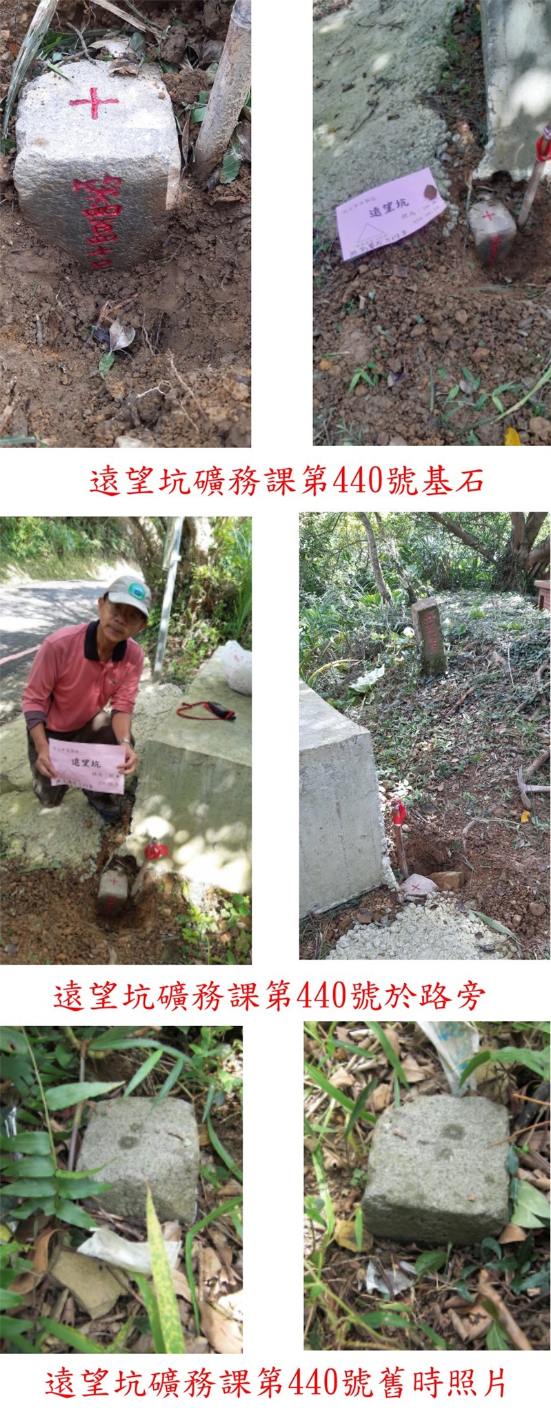 2、遠望坑:位於新北市貢寮區,標高50公尺,鑛務課第440號基石,旁另有顆編號519的無名基石;座標342929 2766695。
