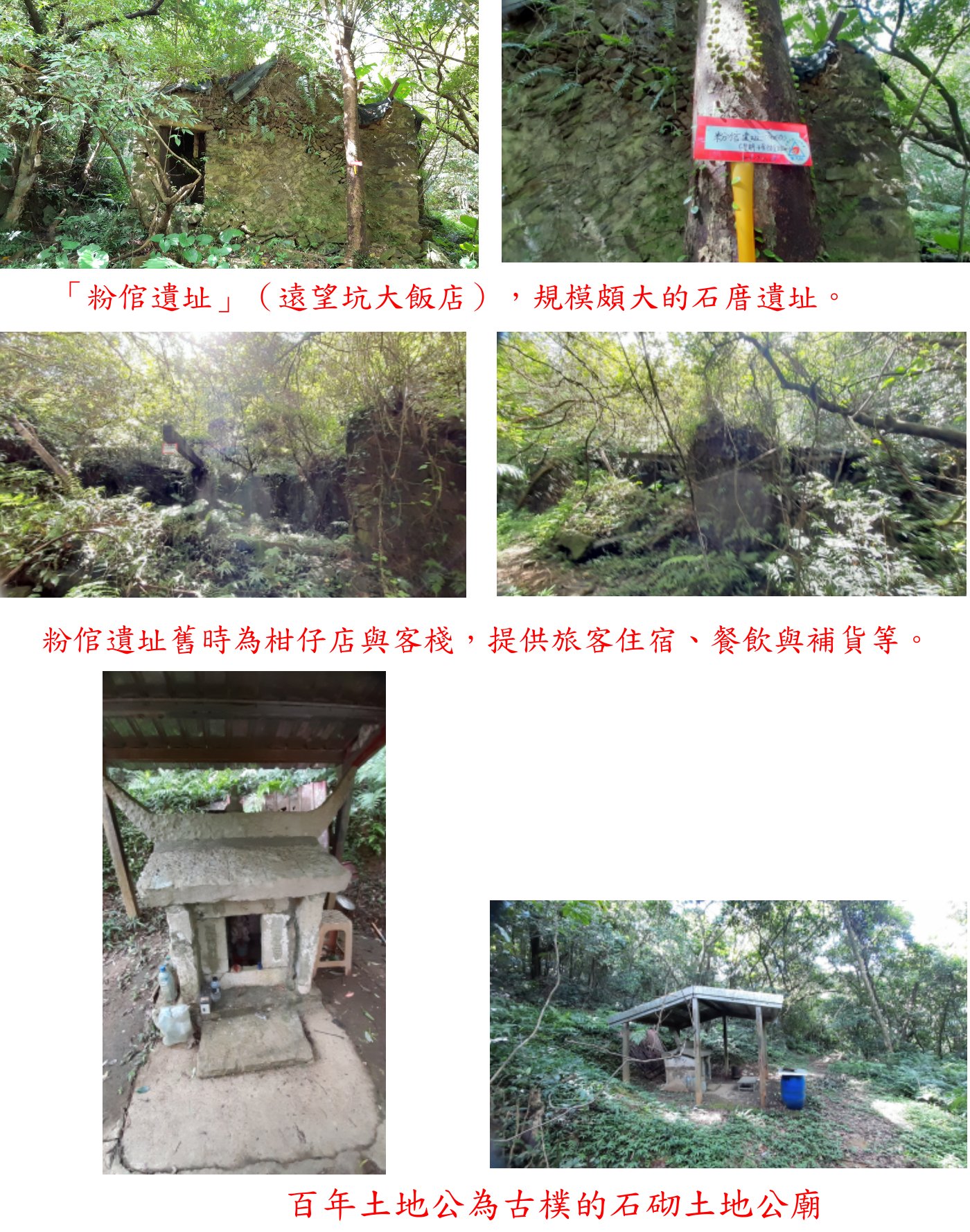 09:15「粉倌遺址」,有標示牌稱此處為「遠望坑大飯店」,規模頗大的石庴遺址,舊時為柑仔店與客棧,提供旅客住宿、餐飲與補貨,「粉倌」的意思應是由女人開設的客棧。