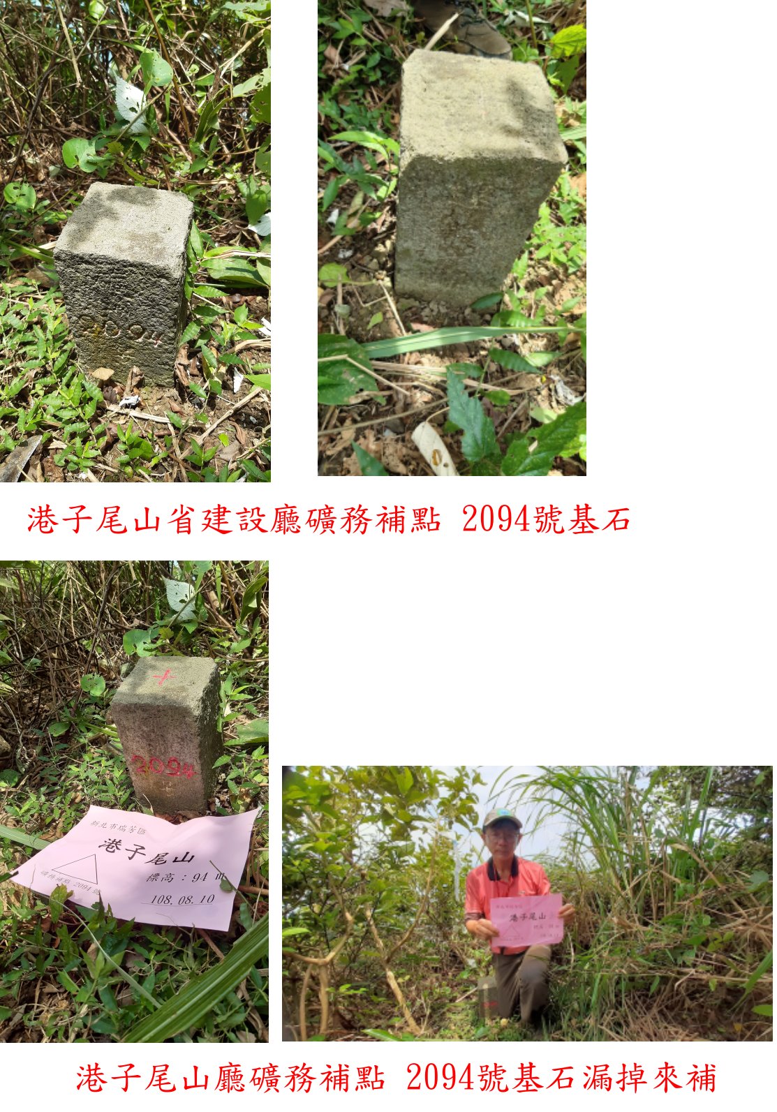5、港子尾山:位於新北市瑞芳區,標高94公尺,省建設廳礦務補點 2094號基石;座標331373 2780821。