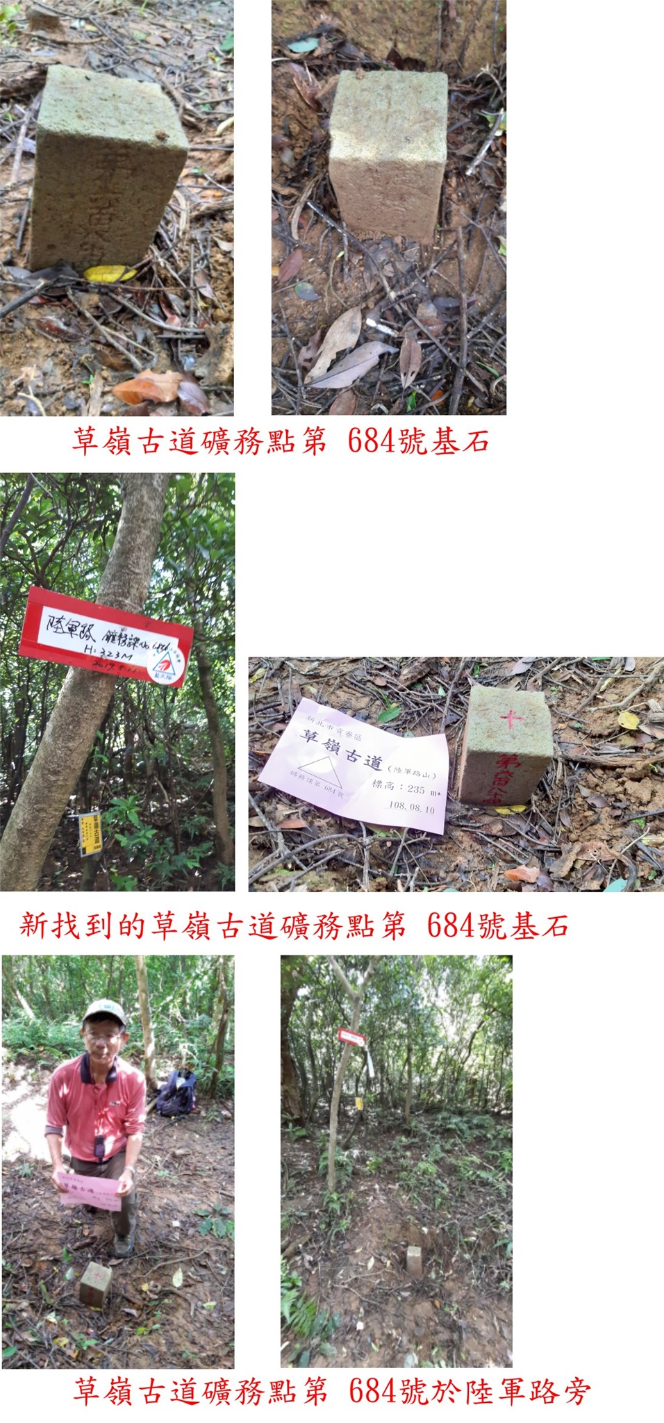 09:42△草嶺古道,高219公尺,於路左見到鑛務點第 684號基石,此點藍天隊剛找到不久,基石應埋土已被挖出;平坦地無展望,上山走33分鐘(含探訪百年土地公6分鐘)。