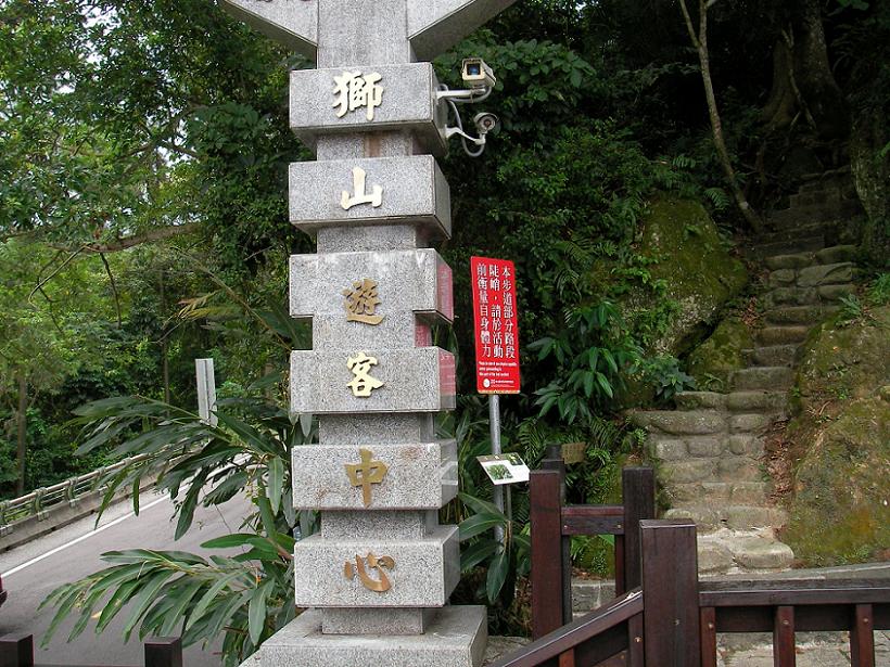 台3線北上,於里程約86.35K時右轉竹41線,一路均循主線往「獅頭山風景區」方向行,行約4.5K抵路右之「獅山遊客中心」。「獅山遊客中心」大門旁(H150M,座標251687*2727794),有「藤坪步道」,步道入口即為猿山第一登山口。「藤坪步道」是一條國家級的健行步道,全長約1300M,每300M即豎立一個里程標誌。路徑乾淨平緩走在樹林下,步道最高點為木造休憩平台,右下往六寮步道,續前行則接上「猿山步道」,步道入口即為猿山第二登山口(H292M,座標251928*2727115,與基點直線距離897M),登山口立有紅底白字的警示標誌,提醒遊客避免誤闖登山小徑。一爬上猿山步道走沒幾步路,就看到樹林內幾條巨大的台灣血藤,這在平常山區是看不到的。雖是小步道,但也非常好走,比獅頭山的山徑好走了幾倍,更比象山的山徑好走幾十倍。