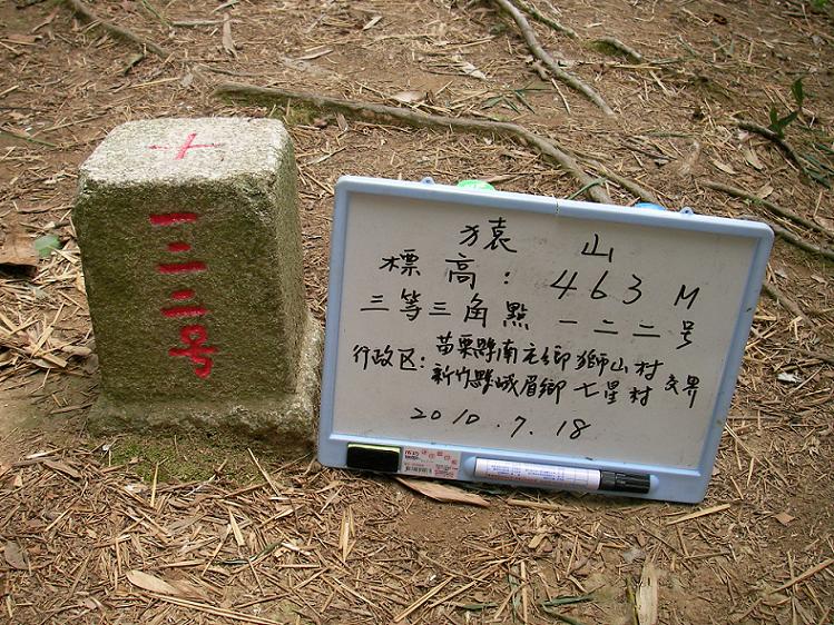 猿山,標高463公尺,三等三角點一二二,基石頂端有缺角,「等」字上端的「竹」已不見,僅剩下端的「寺」,座標251749*2726246,行政區:苗栗縣南庄鄉獅山村、新竹縣峨眉鄉七星村交界。