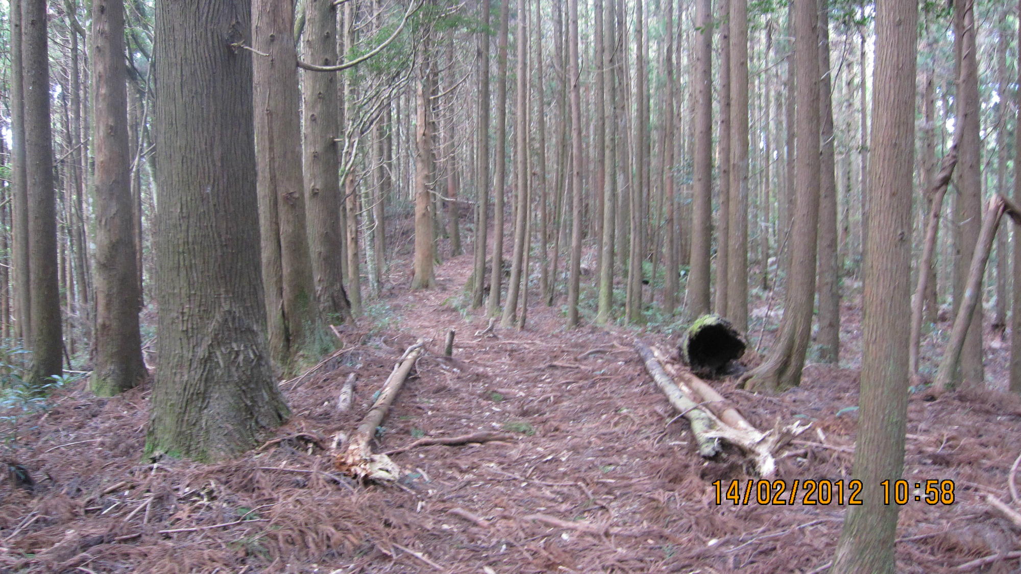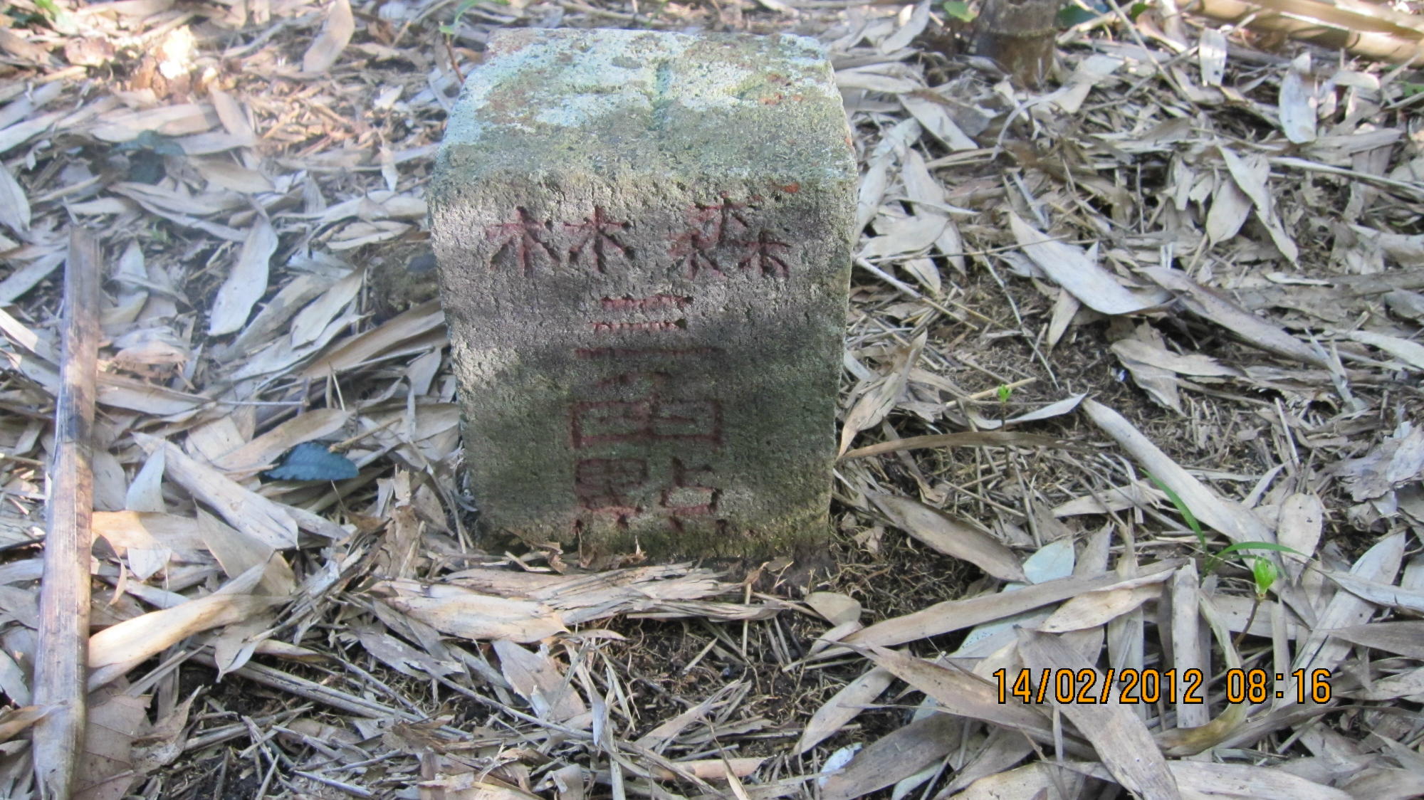 0754啟登,循泥土產道上行,走約150M鏟道盡頭,右入雜林往上,接竹林後遇另一產道轉左,產道寬大好走,前行約20M注意右邊路標密集處,右切上竹林,前行約40m,於竹林間見基點。