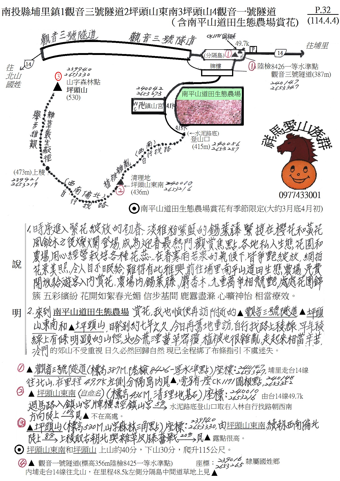 1南平山道田生態農場入口在台14線49.7K處,由鎮山宮牌樓進入