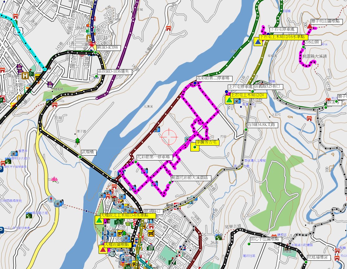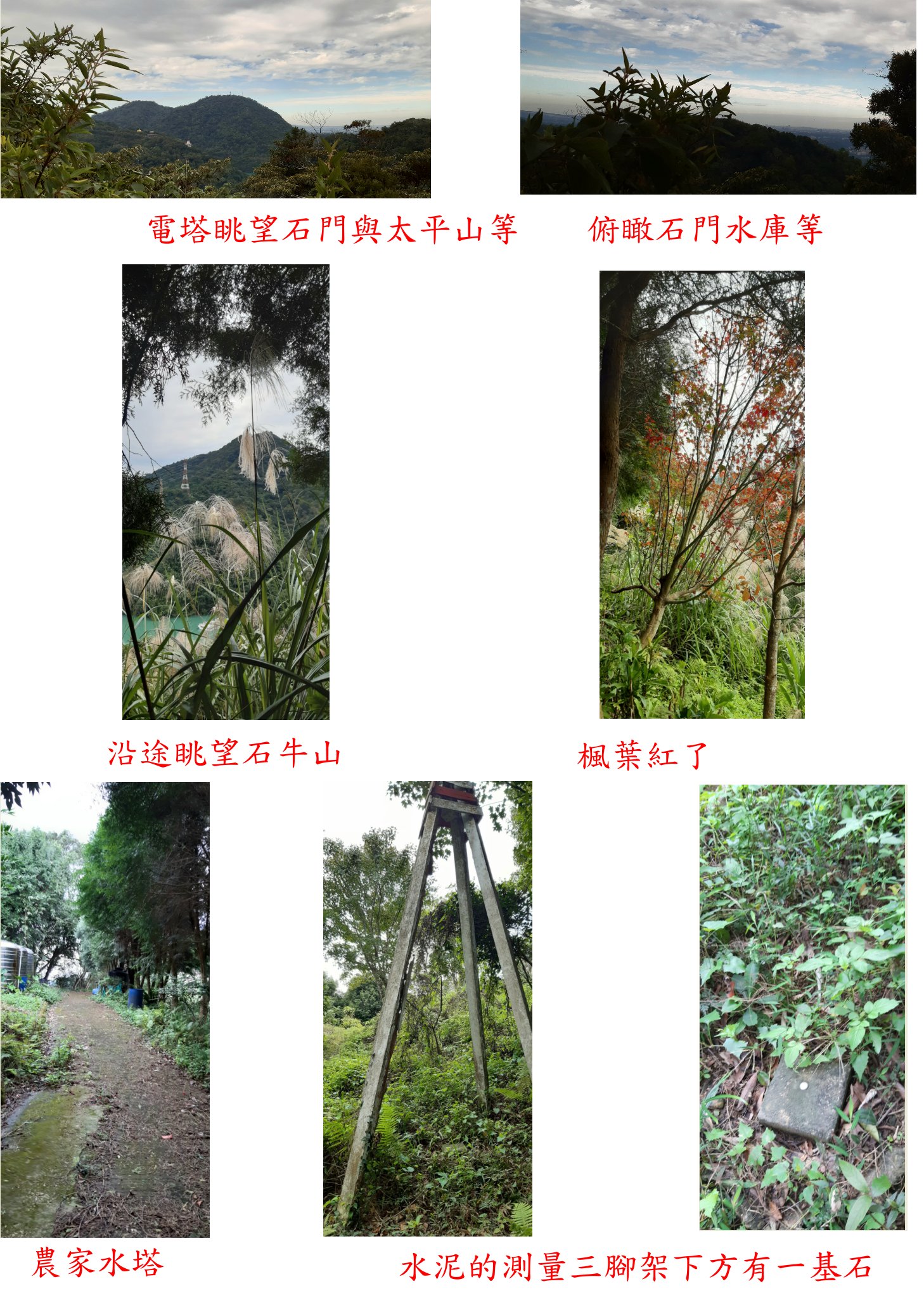 11/28去尋訪石門水庫周遭4顆的三角補點,此行係去尋找其中2顆基石達人謝兄新找出的補點;第1座為蓬萊仙島南峰的昭和四年內務局水泥柱,佛陀世界(童話世界)續行於水庫旁停車,蓬萊仙島山的路線已走過多次,左下水庫邊路況佳的保線路腰繞,經仙島吊橋與鐵橋保線路走57分鐘抵達基石;第2座為蓬萊仙島山的石門3號三角點補石,續行下到鞍部再上坡抵達山頂的基石,由南峰過來只要15分鐘,前2顆基石早年均曾來過;第3顆為蓬萊仙島山北峰的石門04號三角點補石,計畫由蓬萊仙島山北峰直接下切,直線不到170公尺,今日迷糊到忘了帶刀,無路且倒竹密布放棄走此線;第4顆為蓬萊仙島山東北峰的石門5號三角點補石,回到稜線鞍部取左土路腰繞接水泥路至農宅,左上方的三腳架下方有顆測量基石,水泥路續走一小段取左不明顯土路往下,雜草與倒竹很難走,前行下到廢棄民宅區,前行經2個涼亭走荒廢的石板路往下達基石,由蓬萊仙島山過來走41分鐘;再來想找路往北峰04號補石但找不到放棄,原路回至停車處,往返費時3小時又35分鐘;午餐後順道去桃園花彩節大溪園區賞花,五彩繽紛的波斯菊花海很漂亮,逛一圈費時1小時又40分鐘。