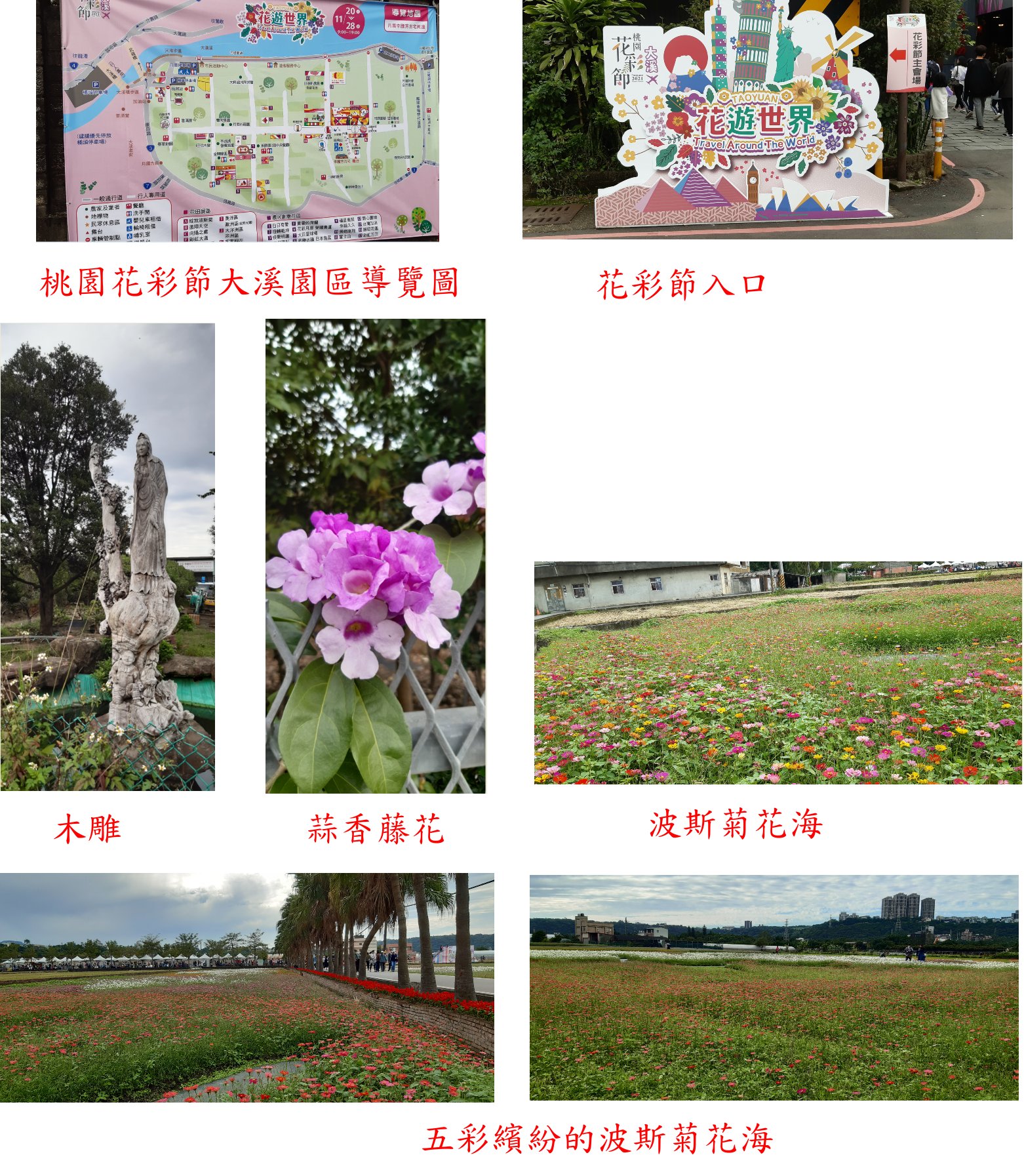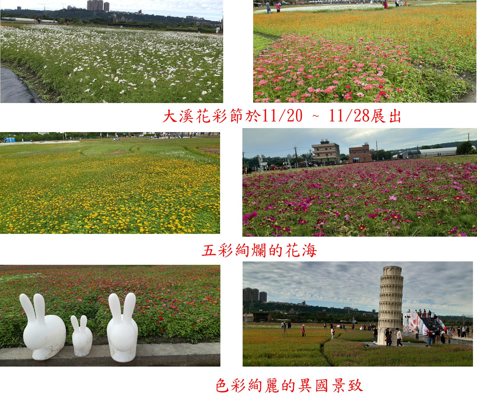 午餐後走台3線至大溪,順道去桃園花彩節大溪園區參觀;桃園市政府交通動線規畫的不錯,且有許多引導人員車多而不亂,停車於第二停車場,很大面積五彩繽紛的波斯菊花海,很用心規劃許多造型的花海,但或許只能用空拍的能看到全景,且此全園區看不到主題,但無損花海的美麗與賞花樂趣,遊客頗多園區繞一大圈,想順遊李騰芳古宅但大排龍就放棄了,逛一圈費時1小又40分鐘。