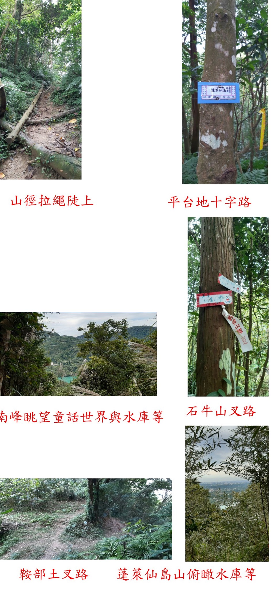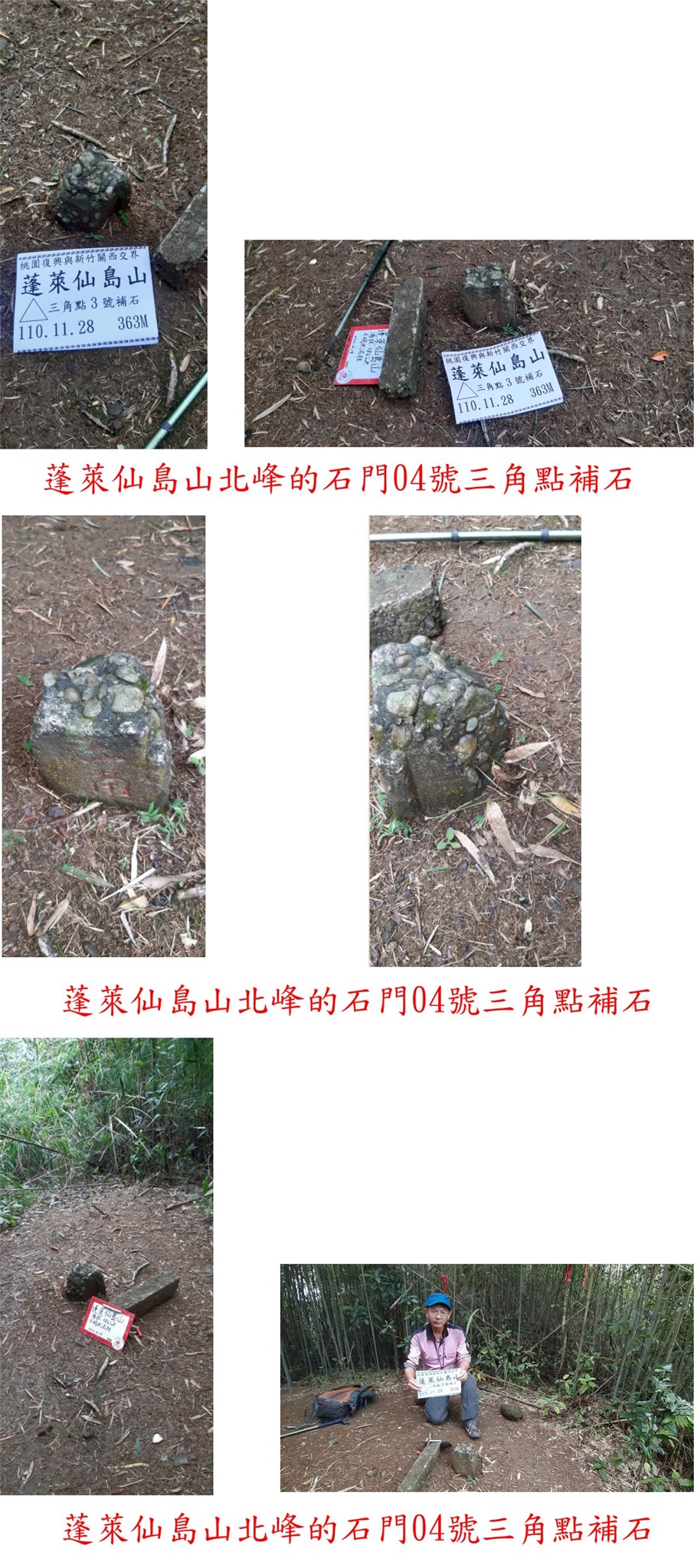 3、蓬萊仙島山北峰:位於桃園復興與新竹關西交界處,標高295公尺,石門04號三角點補石;座標273954 2744605。