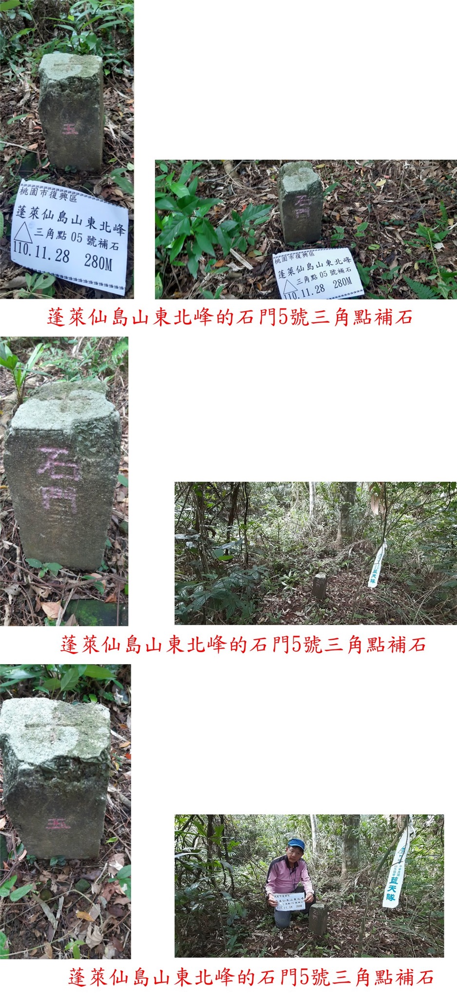 4、蓬萊仙島山東北峰:位於桃園市復興區,標高280公尺,石門5號三角點補石;座標274617 2744753。