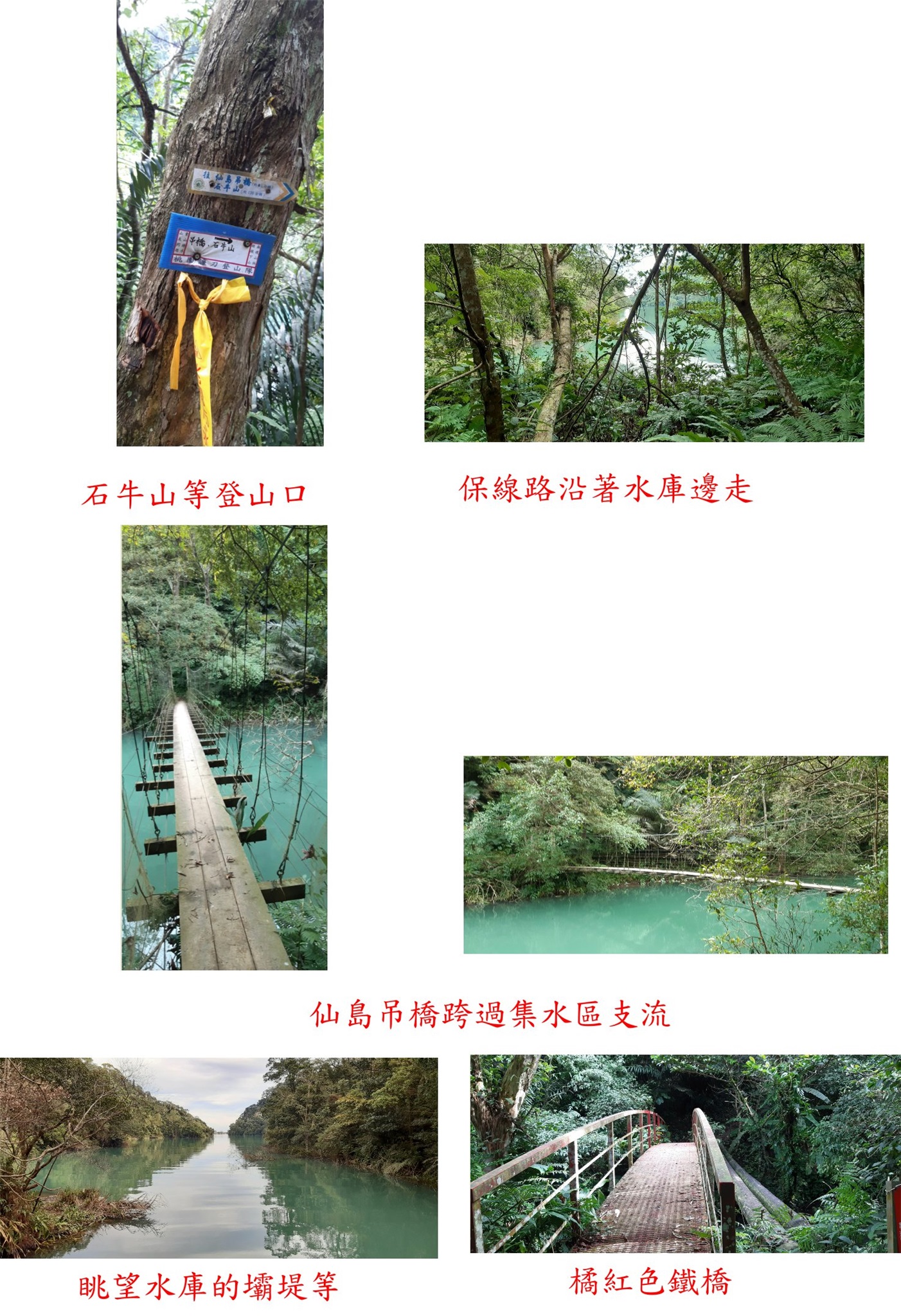 08:39仙島吊橋,此吊橋應改建過跨過集水區支流,湖光山色景色優美,眺望佛陀世界(童話世界)與水庫的壩堤等;過橋後續行保線路。