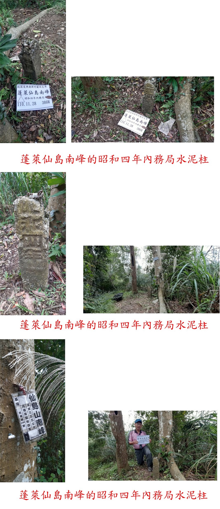 1、蓬萊仙島南峰:位於桃園復興與新竹關西交界處,標高350公尺,昭和四年內務局水泥柱;座標274205 2744114。