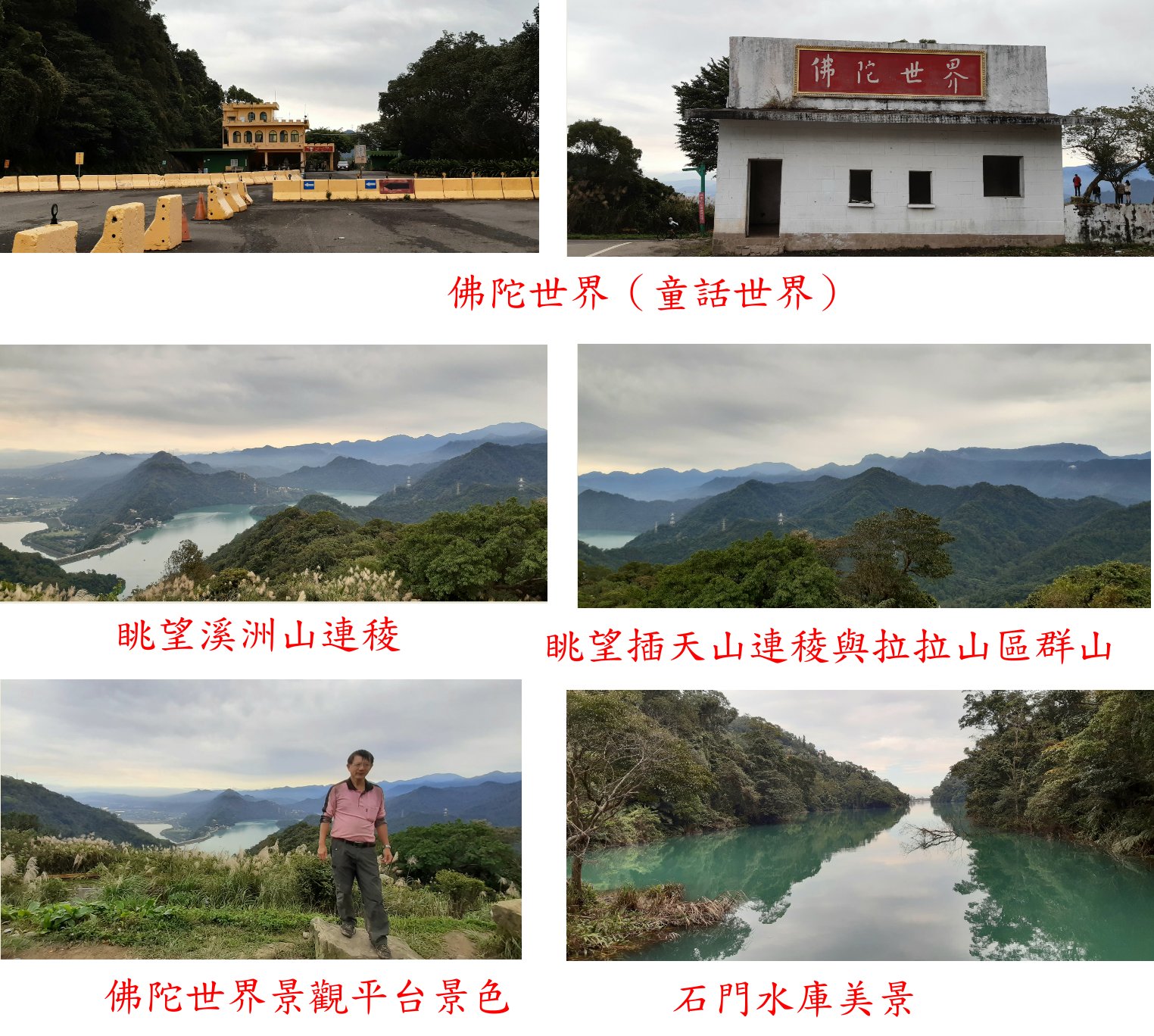 12:15租坑路3.7K的佛陀世界景觀平台,視野超讚,俯瞰石門水庫與大溪等區,北面眺望石門與太平山等,北面為溪洲山連稜,東面眺望插天山連稜與拉拉山區群山;再來驅車至石門水庫附近的坪林午餐。