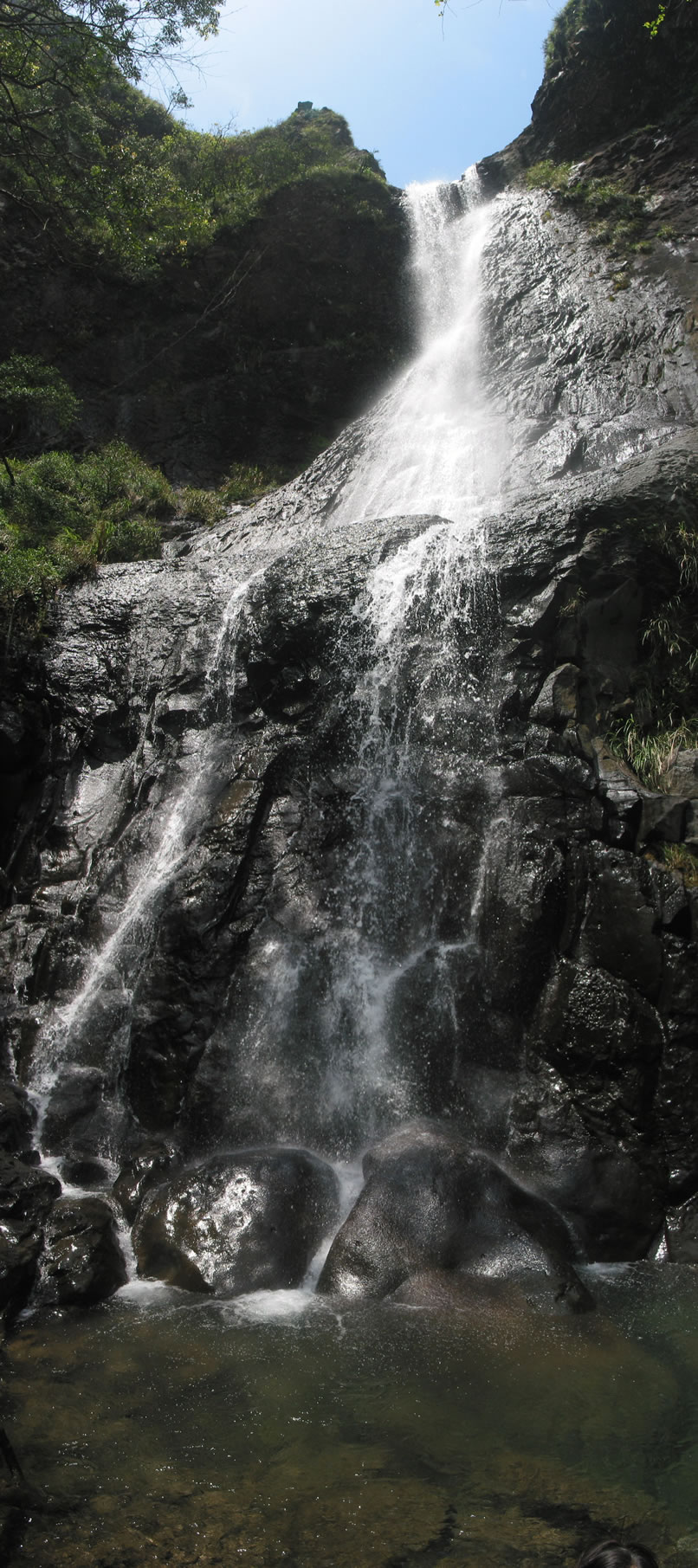 ◎這是陽明山區最長的瀑布,瀑布的水沿著垂直岩壁傾洩而下,站在瀑布下方,更顯得自己的渺小。這條阿里磅溪溪水朝北下流,經石門鄉由十八王公廟旁入海。