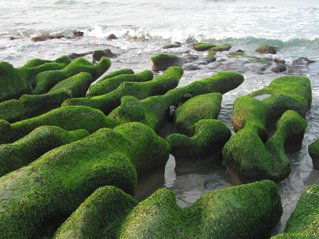 2.冬季東北季風盛行時,浪花滋潤了石槽的岩面,也開始滋生「石蓴」、「裂片石蓴」和「扁石髮」等綠色的海藻,等到四月份東北季風漸歇,石槽就長滿了一大片綠色的海藻,也形成令人驚嘆不已的「綠石槽」海岸景觀。