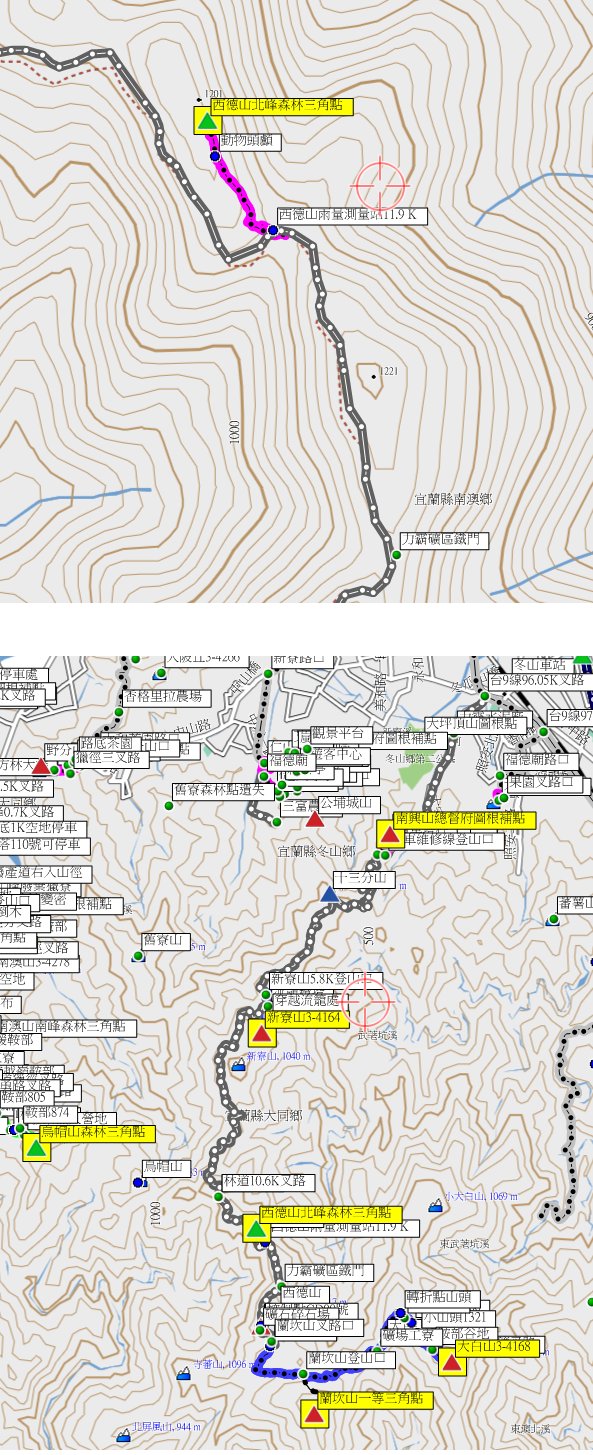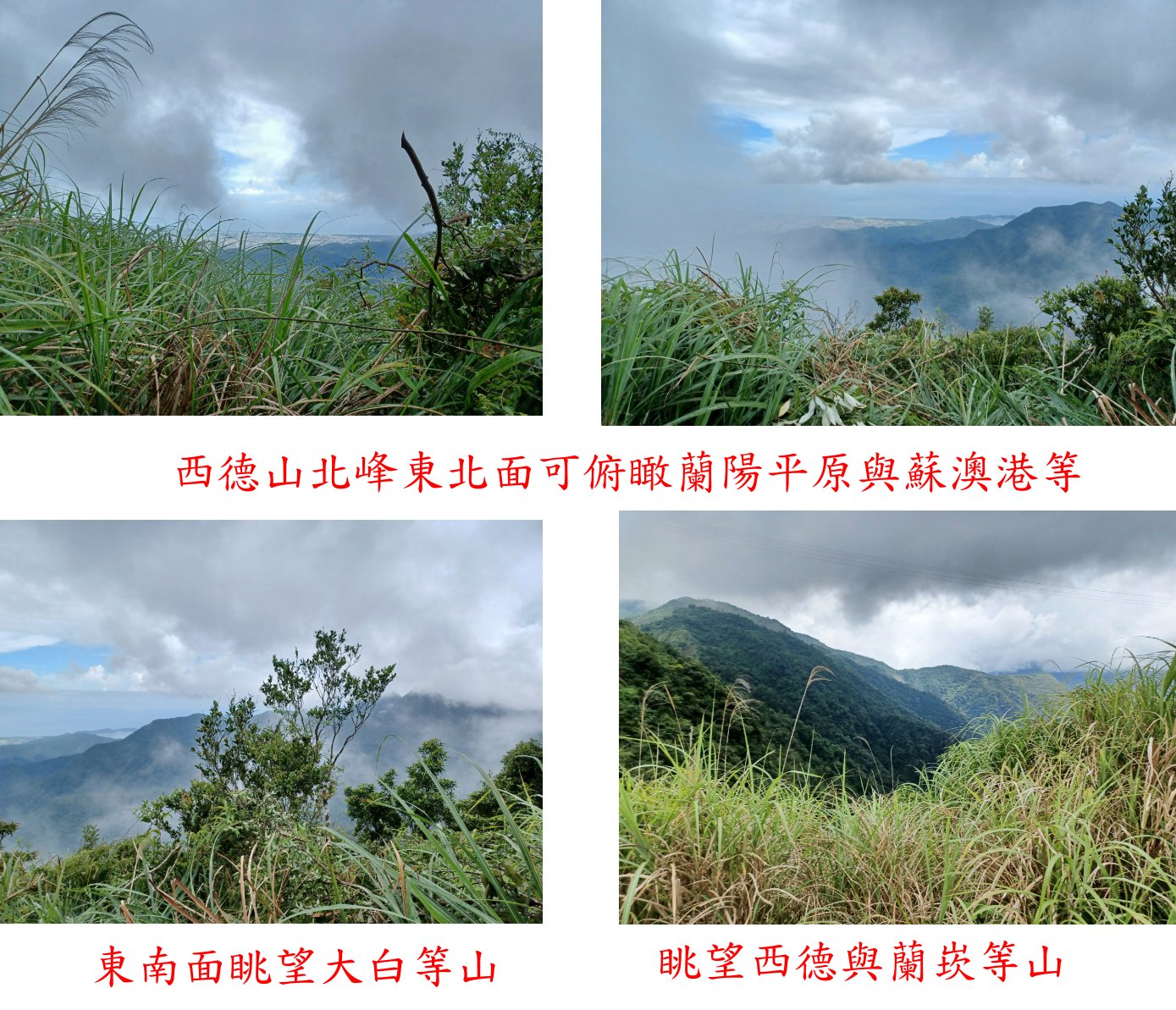2、西德山北峰:又稱蘭坎山西北峰,位於宜蘭縣南澳鄉,標高1191公尺,補山10森林三角點;座標325248 2717744。