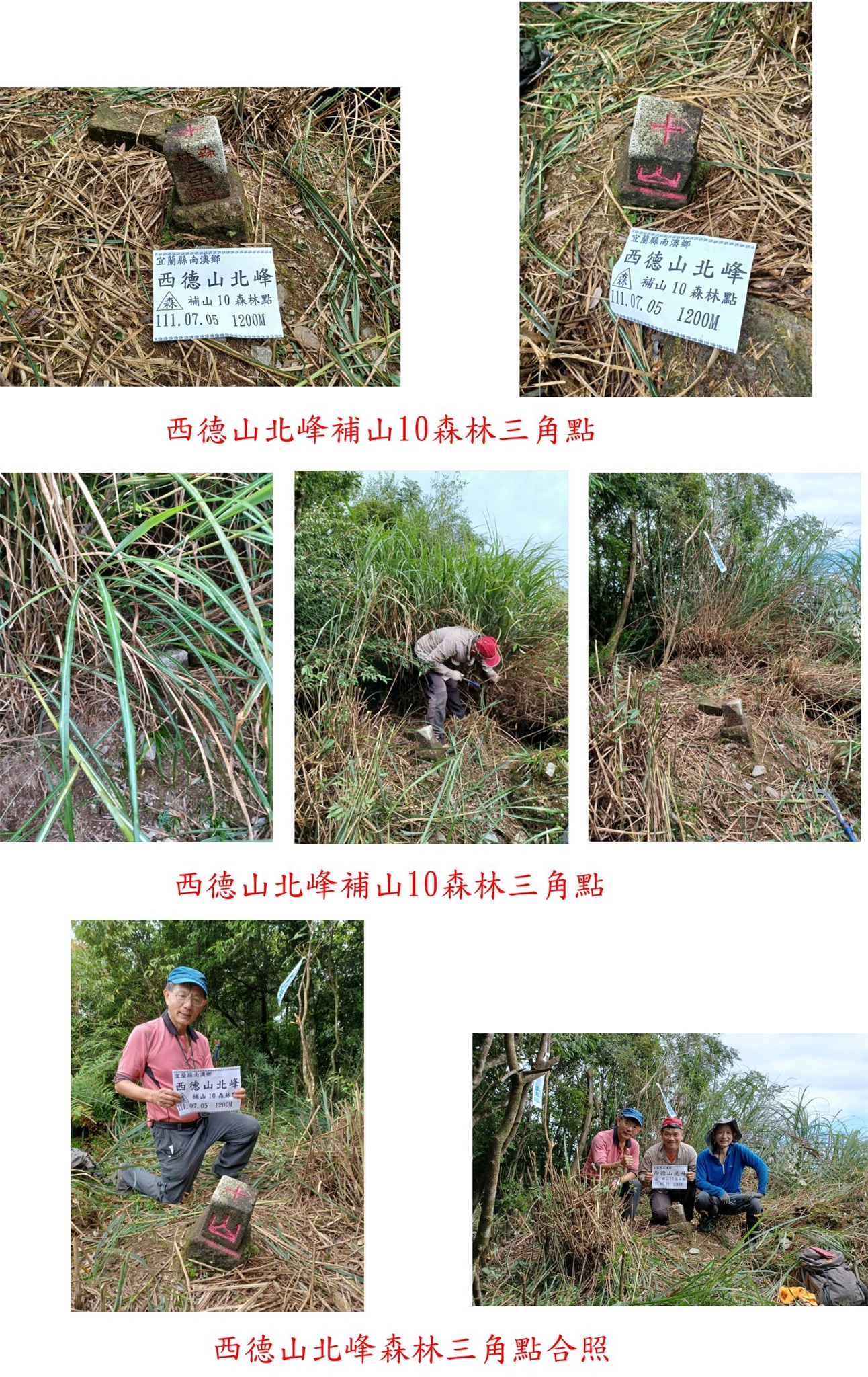 7/5約山友到宜蘭撿幾顆新出土的基石,第1顆為雙子山東南峰森林點,到南澳走宜57線至南澳古道入口叉路,右轉過溪底便道至農路1.3K停車,走土路上山,至2.4K路底前,取左路況佳的獵徑上山至山頂見到基石,上山走50分鐘;回程於金洋產道約2.1K路旁,找到1顆台電梅檀BM01號水準點;第2顆為西德山北峰森林三角點,回到冬山走安平坑林道水泥路上山,走漫長林道至11.9K的西德山雨量測量站停車,登山口有芒草大軍伺侯已砍出一條康莊大道,走27分鐘於山頂芒草叢中見到歪斜的基石;第3顆為參上山省政府圖根補點,至玉尊宮走農路至淋漓坑的土叉路停車,走一小段土路隨即上切,芒草與黃藤夾道要砍,短短的距離上山走26分鐘;第4顆為參上山北峰山字水泥柱,於參上山北面約60公尺處,此點無人造訪,距離很短但植被很難纏,砍路費時10分鐘方抵達基石,水泥柱整根被青苔包覆。