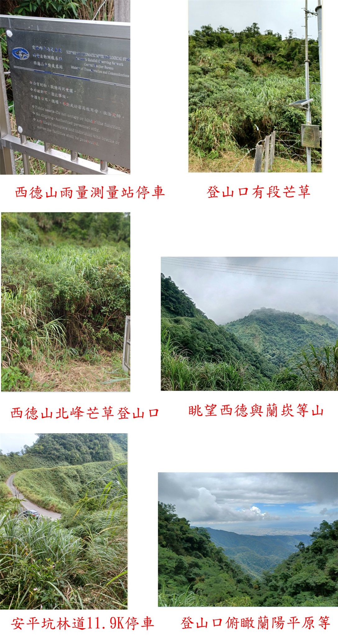由南澳走蘇花改回到蘇澳接到台9線北行至96.05K叉路,路口有大安廟牌樓,左轉宜35線(大安路)走2.6K至舊時管制哨,安平坑林道入口【0K】,以前來過幾次都有管制現已開放;走路況佳水泥路的林道上山經5.8K新寮山登山口,續行至林道10.6K叉路,右線往烏帽山不取,續前行至11.9 K的西德山雨量測量站停車;高