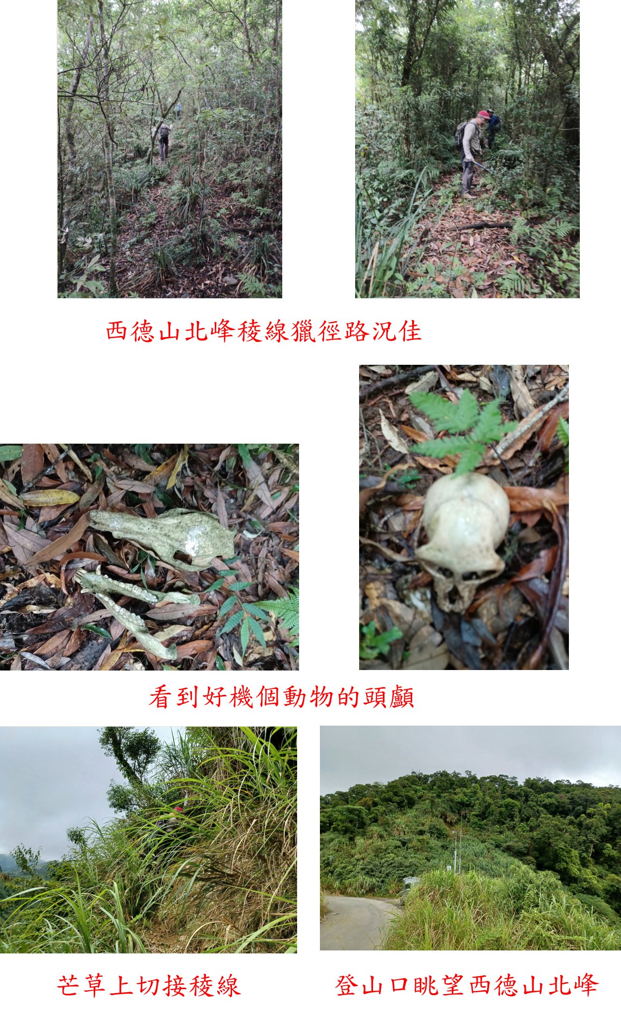 路左為高密芒草叢,二把刀乾淨俐落的砍進去、我在後頭綁上路條,很快的砍出一條康莊大道上到稜線;平緩的稜線有條明顯獵徑,沿途看到好機個動物的頭顱,接近基石時芒草漸多右繞而過,隨即抵達山頂,於芒草叢中見到歪斜的西德山北峰森林三角點;沿途未見任何路條,將芒草砍開方便拍照,東北面可俯瞰蘭陽平原與蘇澳港等,上山走27分鐘;拍照後原路回,此山累計爬升