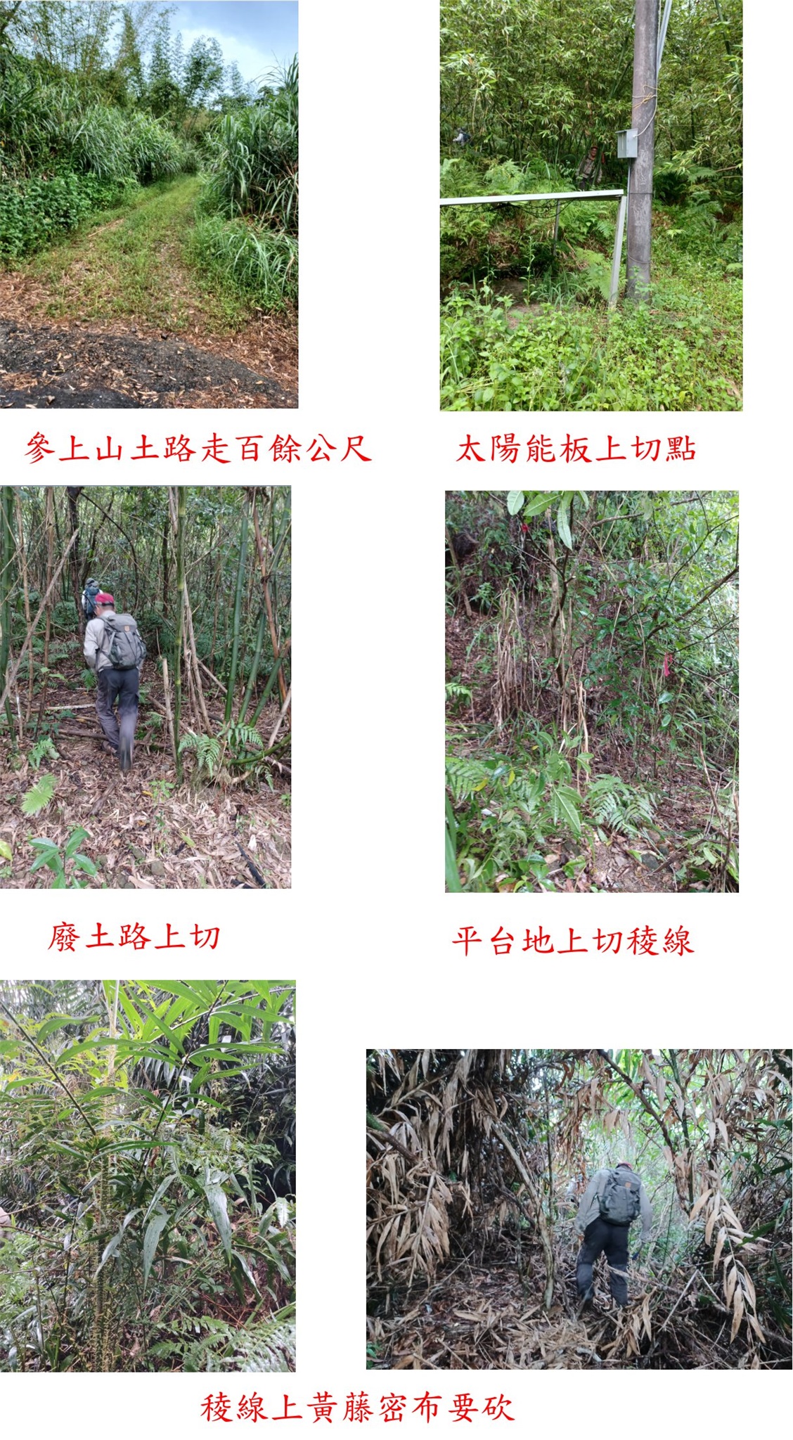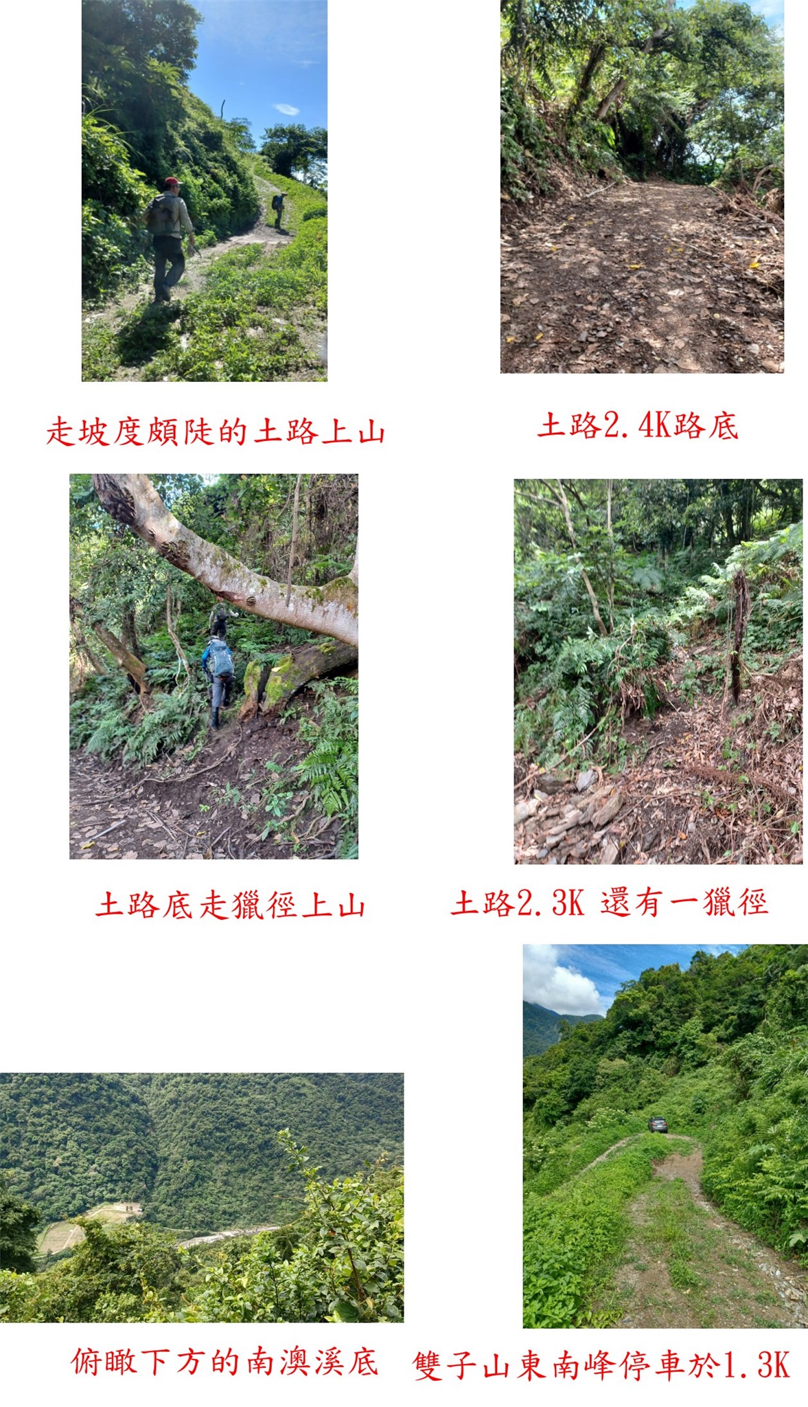 走坡度頗陡的土路上山,倘路面乾燥四驅車應可續行,沿途有儲水的水桶與舊水管等,土路前行至2.3K路左有一明顯獵徑入口1,續行走