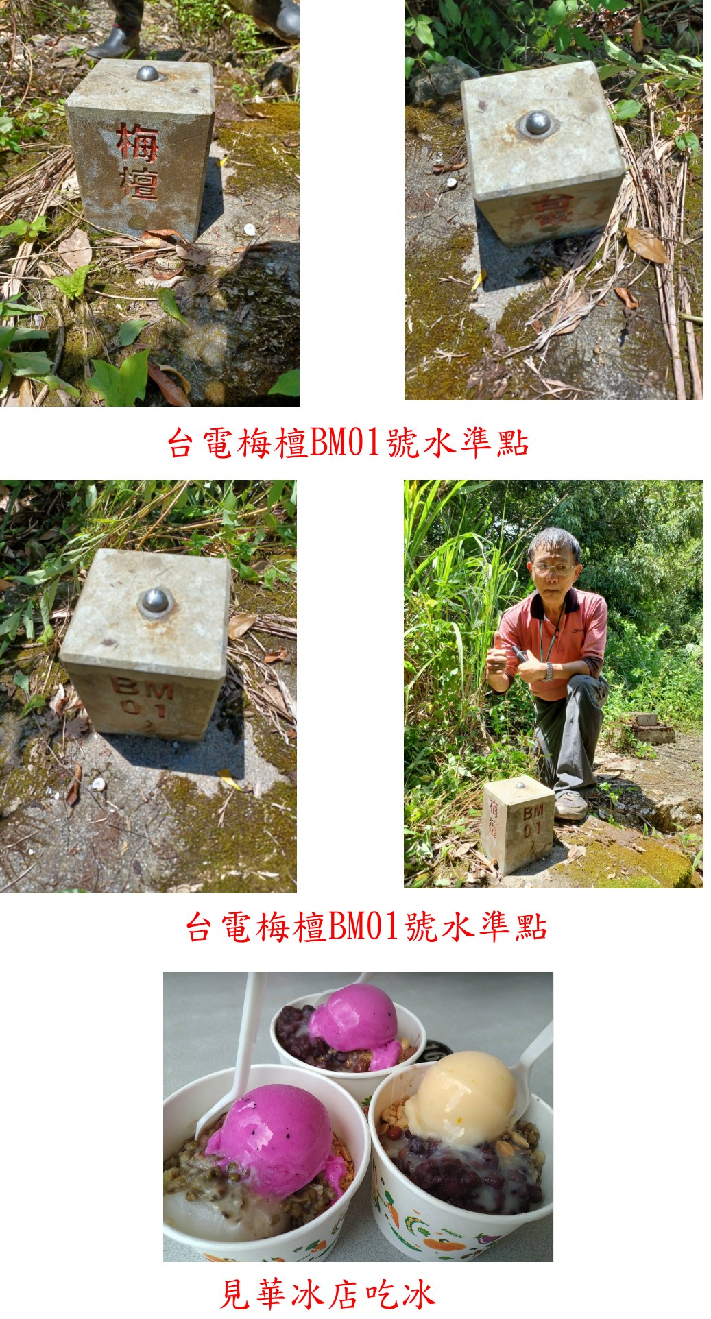 車行原路回至金洋產道約2.1K路旁,探訪溪對面的大南澳嶺南南峰補沖M登山口,路左見到1顆台電梅檀BM01號水準點,設立於92年4月;原路回到南澳接上的見華冰店吃冰。