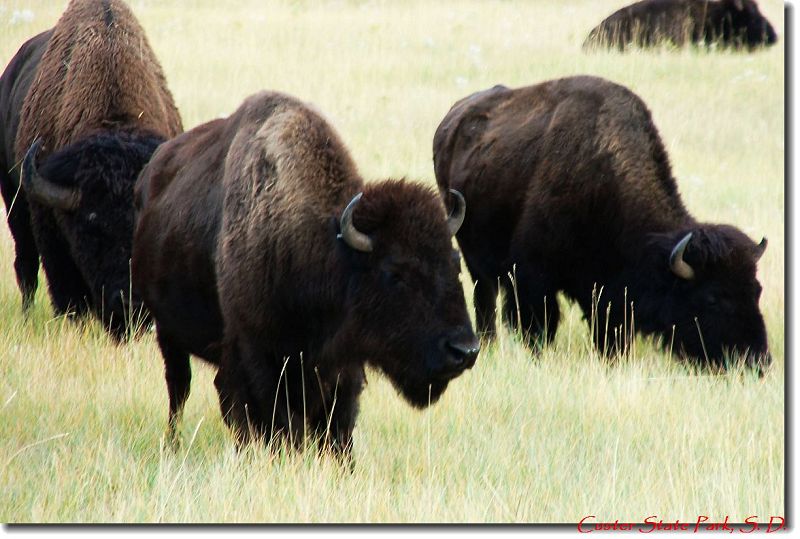 北美野牛一大群,滿山遍野,真想看看幾個牛仔騎著馬、揮著鞭索,驅趕這群野牛,然後是萬馬奔騰、塵土飛揚,和上牛仔的吆喝聲…..!