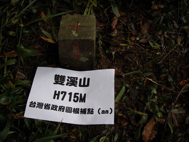 一路聽著林教官精采的解說,9:30到達一鐵皮屋(有木179號之1)小休,取右續行,終於11:00抵達雙溪山,標高715公尺,有一顆台灣省政府圖根補點,拍完照,回至往東眼山東支稜、山腰造林路叉路,續前行,循腰繞造林路,於12:05時為避開土蜂,下切走林教授在先前開出的路,後經過水源,於12:20休息午餐,吃飽喝足,13:30再開爬,先陡上40分至往東滿步道叉路,小休後,取右下往雙溪山,繞行一O行,於16:45回抵登山口,換好裝,因我們明天有要事,明天精采的「野外求生」,只得忍痛缺席,17:30道別大夥,驅車回程,約20:00前回到家。