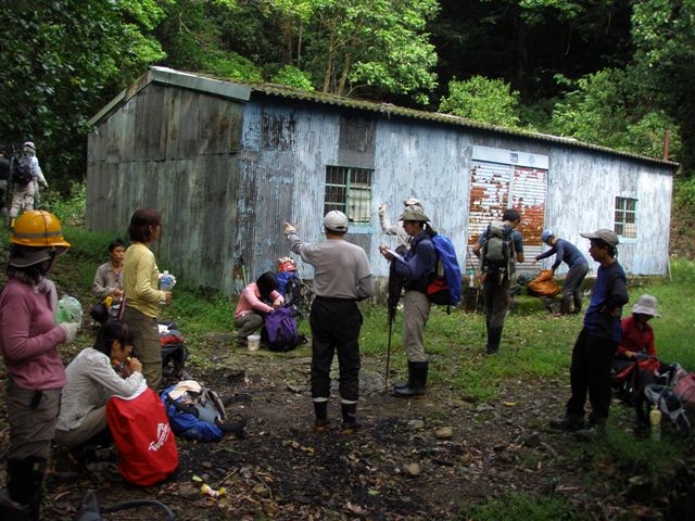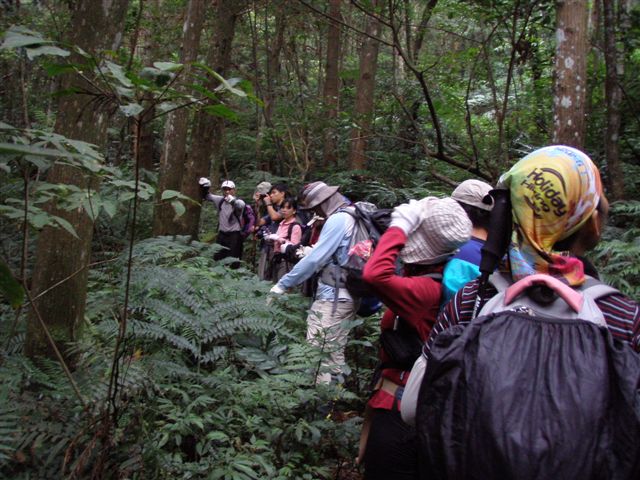 與阿全坐在路旁,8:20過後陸續有人到來,不久看到來了輛小驕車,車內2位年輕女孩對著我們叫「恩姐」,讓我們好訝異,原來她們常看我的Yahoo部落格,由此可見這網路的力量,真是無遠弗屆。終於林教授出現了,集合點名後,北部共有12人,中部有5人,包括林教授及林教官,今天共有19人參與。首先林教授簡單分組,並說明今天路線會碰到土蜂(幾天前網路已有說明雙溪山有土蜂),經過時分小組通過,並將雨衣拿出遮蓋頭部(保護頭部為主),交代秋天登山儘量避免穿鮮豔衣服。