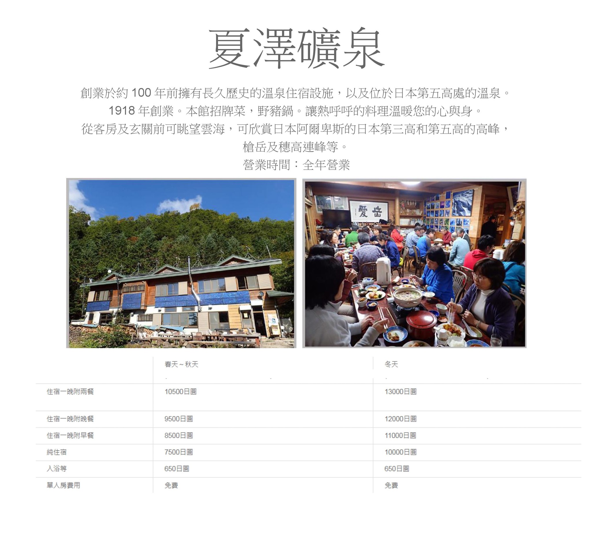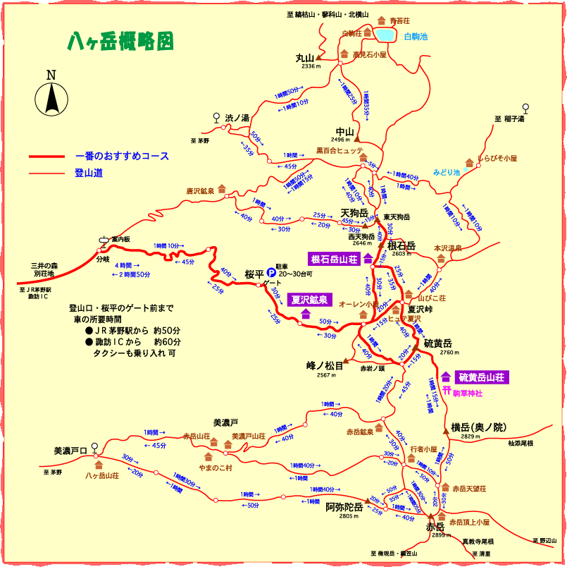 我們提供:JR茅野車站-櫻平登山口免費的接駁,以及櫻平登山口至夏澤礦泉行李的接送,登山客們亦可以無裝從櫻平登山口健行至夏澤礦泉。