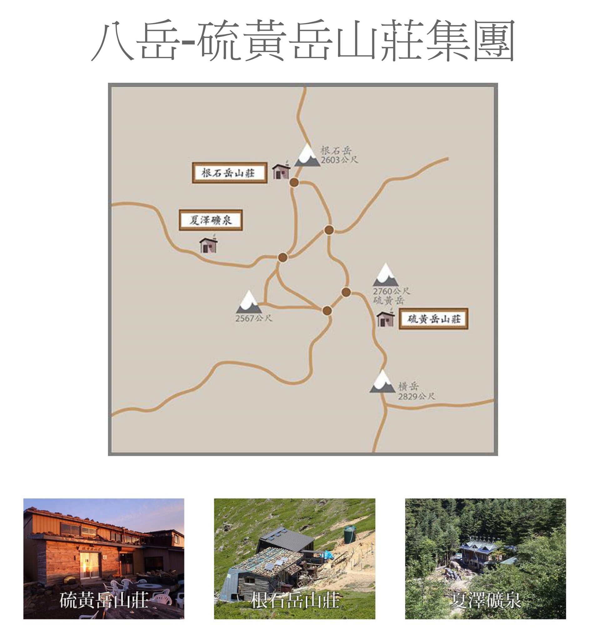 我們是來自日本長野縣八岳的硫黃岳山莊集團,本社旗下於南八岳區塊有三間山屋: