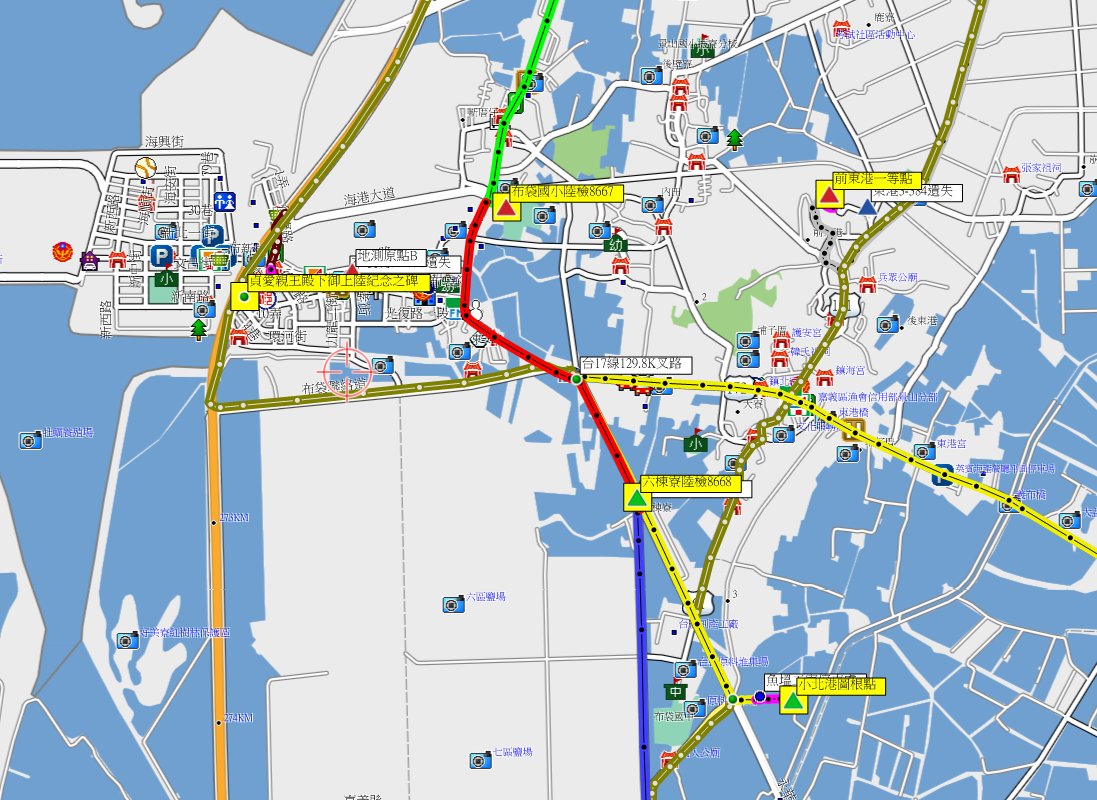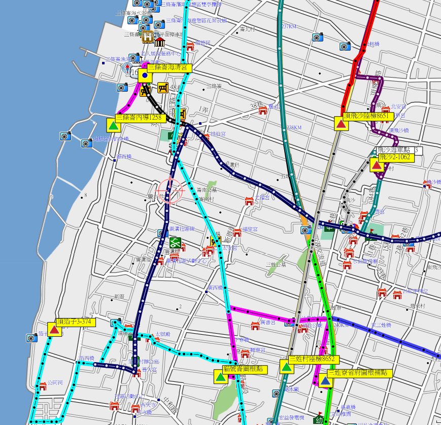1、三條崙:位於雲林縣四湖鄉,標高6公尺,聯勤測量隊內導1258號基石;座標162455 2616971。