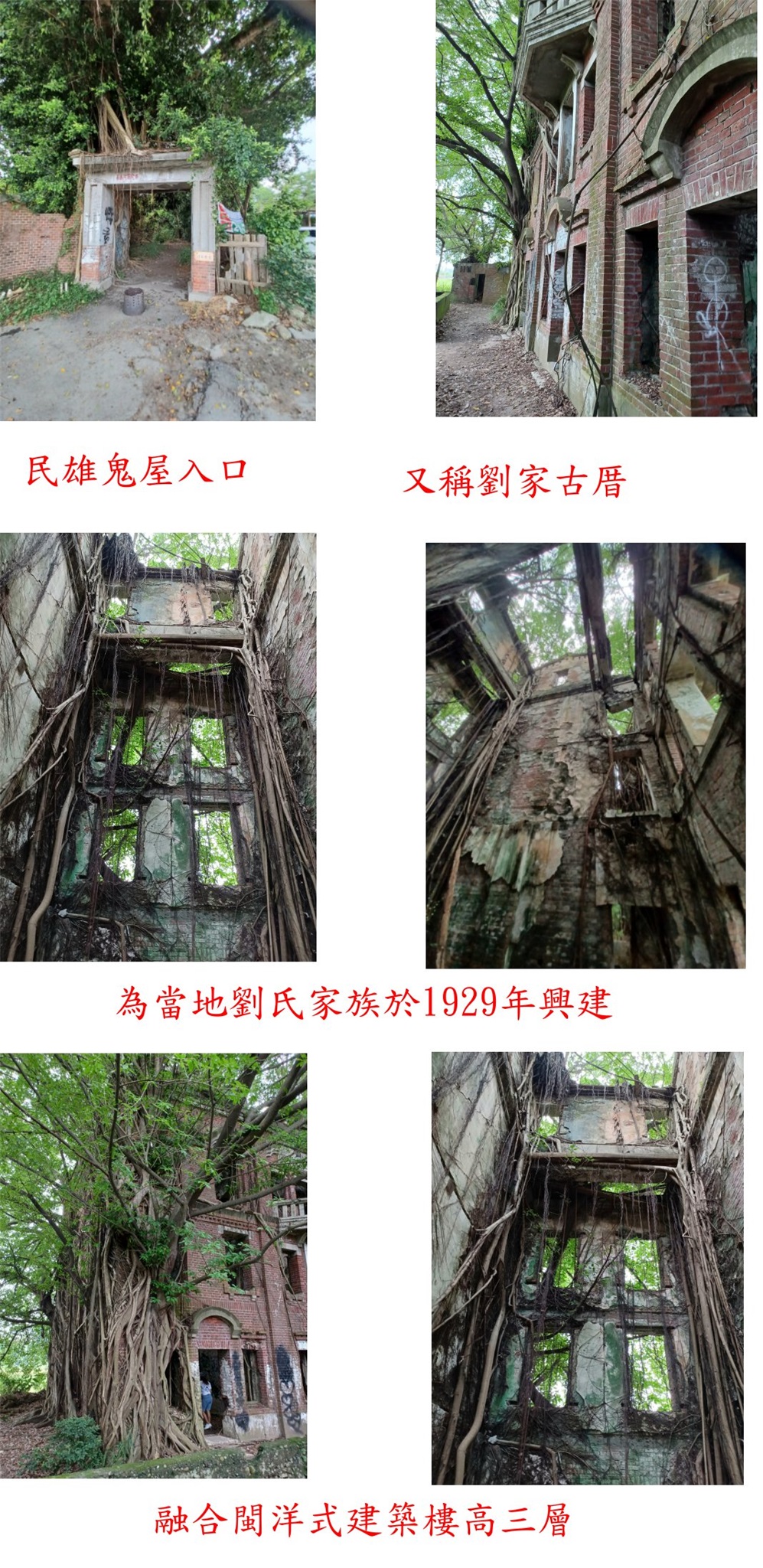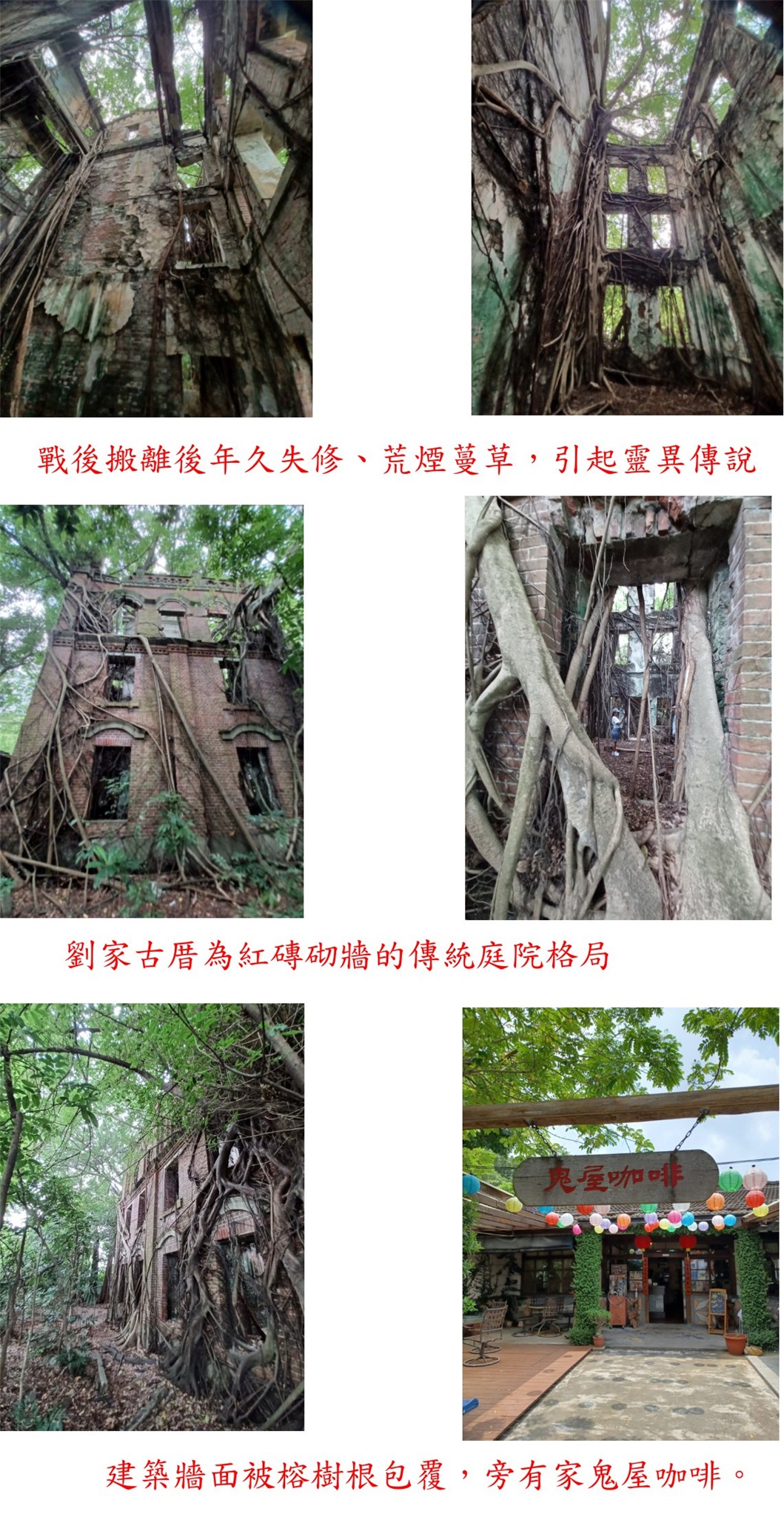 為當地劉氏家族於1929年興建,融合閩洋式建築樓高三層、紅磚砌牆的傳統庭院格局,戰後搬離後年久失修、荒煙蔓草,引起靈異傳說,現成為當地觀光地點,建築牆面被榕樹根包覆,旁有家鬼屋咖啡。