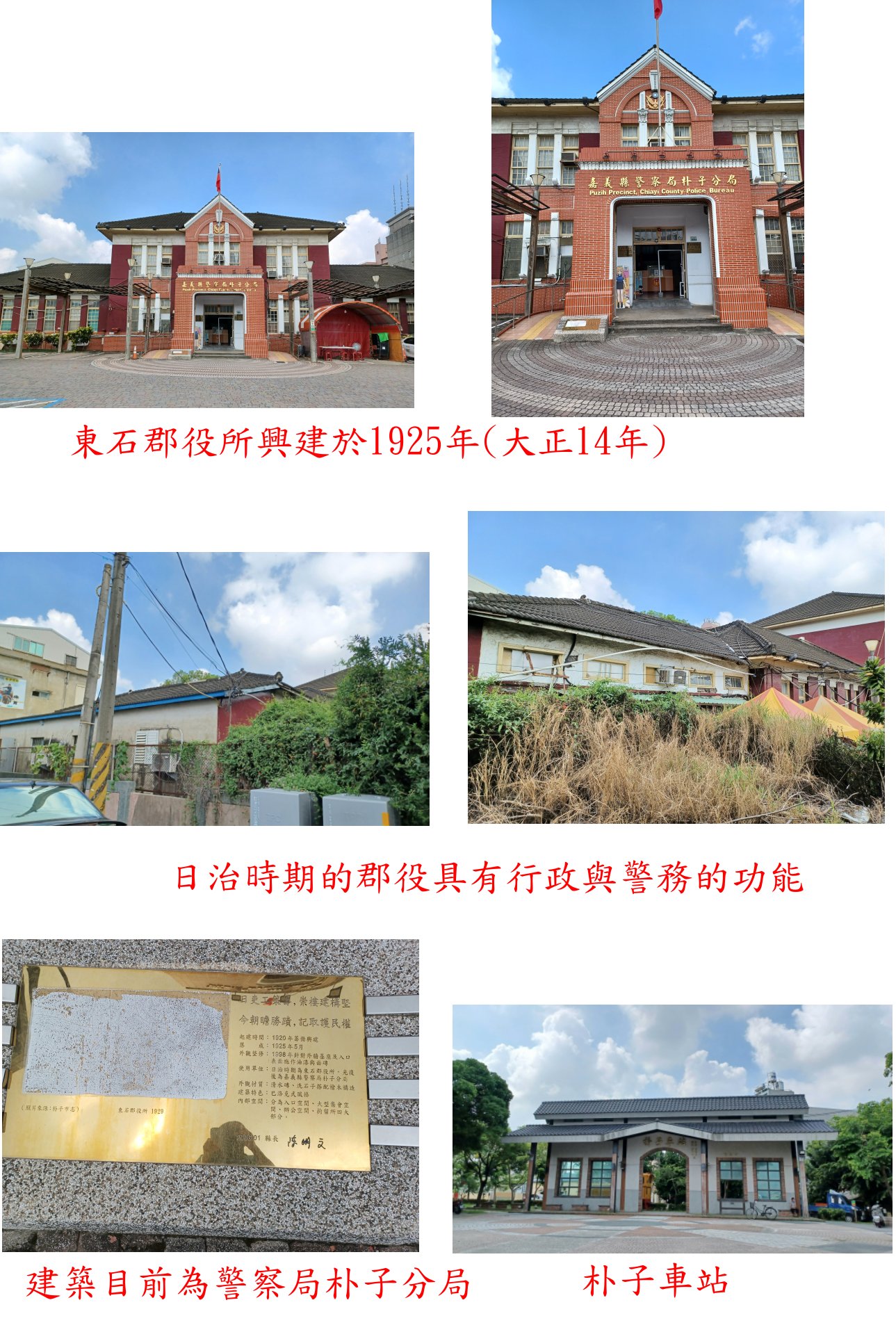 東石郡役所興建於1925年(大正14年),日治時期的郡役具有行政與警務的功能,目前仍保持古樸典雅的磚瓦建築,此棟建築目前為警察局朴子分局。
