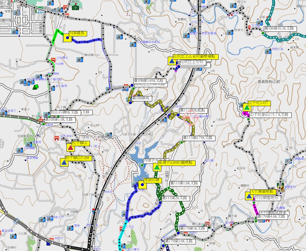 2、開元後山:位於嘉義大林與梅山交界處,標高162公尺,土地調查局圖根點;座標201149 2609748。