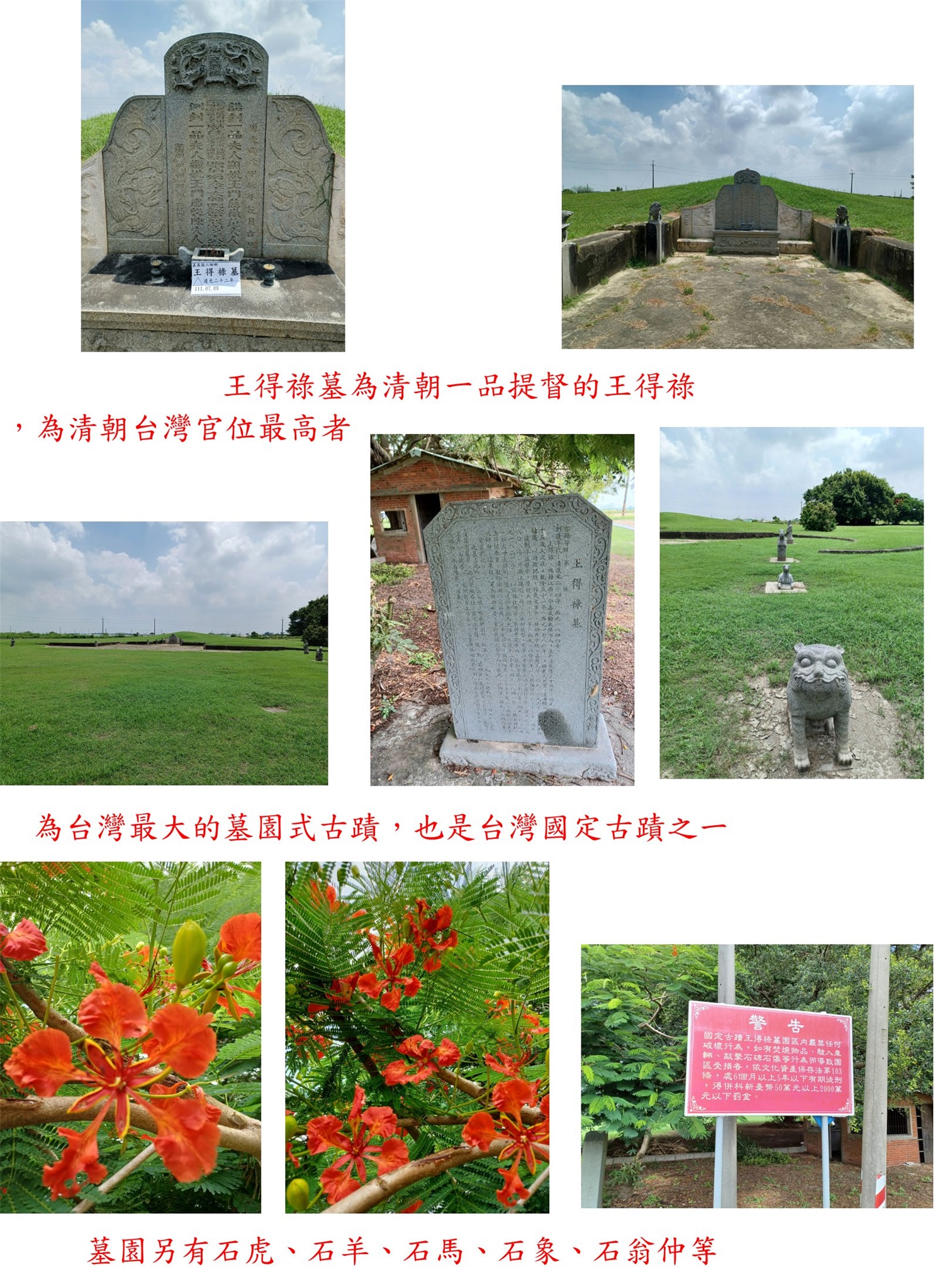 墓主為清朝一品提督的王得祿,於道光二十一年(1841年)病逝享壽七十二,為台灣最大的墓園式古蹟,也是台灣國定古蹟之一,王得祿為清朝台灣官位最高者,因此其陵寢氣勢頗為恢弘,墓園另有石虎、石羊、石馬、石象、石翁仲等石象生等重要歷史文物。