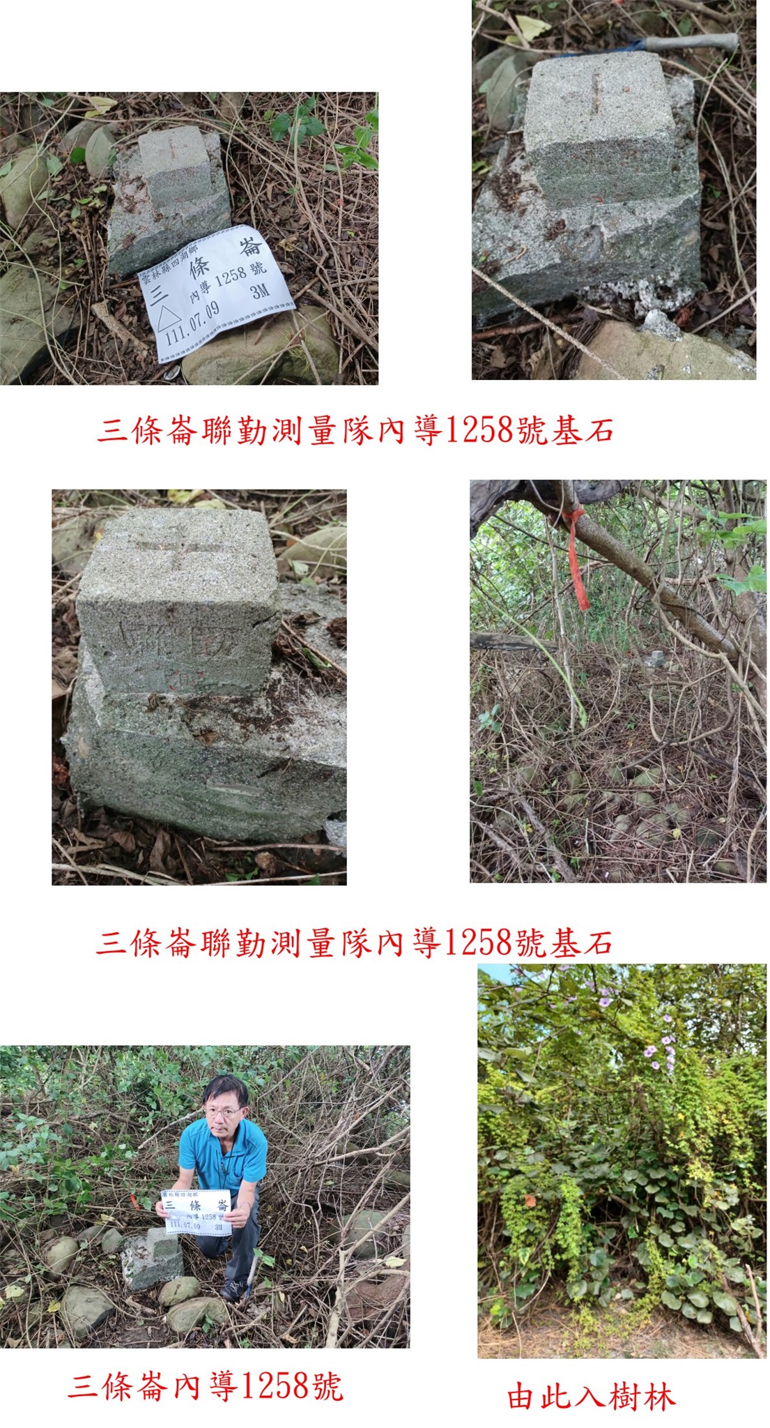 跟隨路條進入路右樹林,隨即見到三條崙的內導1258號基石,聯勤測量隊埋設於民國78年;此點應該是劉兄找到的來補,西面為養殖場,蚊子有夠兇悍拍照後趕緊離去,此點往返費時7分鐘。