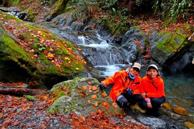 10:30離開合歡山往梨山方向,過了大禹嶺隧道後,再往前過了108K會看到一座橋,就是「楓之谷」入口。有上游溪谷和下游溪谷可選擇,上游溪谷河道較為寬廣,地勢較平坦好走,下游溪谷夾在兩座山谷之間,沿路比較濕滑陡峭難行些。我們先往上游走,是碧綠溪的一條小支流,因就在公路邊,走個幾步就能到達;小溪流、小瀑布加上滿滿溪谷的落楓,可想像紅楓極盛時的璀璨,在此咨意取景,細心品味,盡情欣賞。
