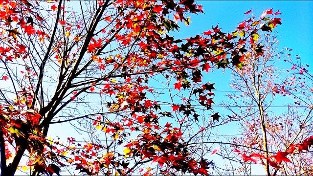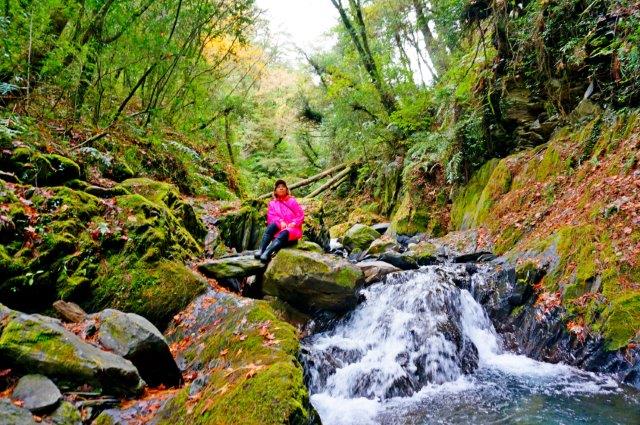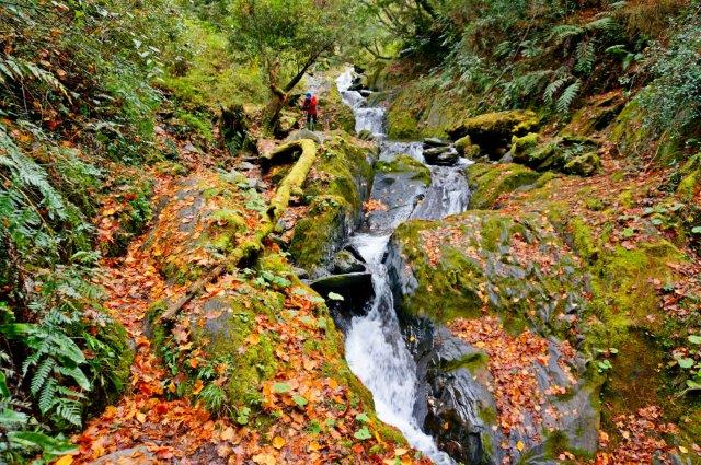 之後跨過路邊護欄拉繩往下游,山谷旁因為楓樹紅紅綠綠好不熱鬧,鑽近溪谷,滿滿溪谷的落葉掉落在岩石與青苔上,紅紅黃黃的落葉,清澈的溪谷,構成一幅幅美麗的圖畫。溪流潺潺在滿滿落楓的河谷裡悠悠地吟唱,夢幻浪漫,造訪者無不驚呼,真是太美了!
